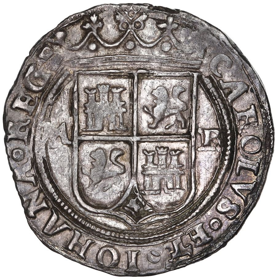 Mexico City, Mexico, 1 real, Charles-Joanna, "Late Series," assayer R to right, mintmark M to left (M-R), NGC AU 50. Nesmith-68 type; Cal-70; S-M7; KM-9. 3.42 grams. While Nesmith thought assayer-R coins were very rare and cataloged few of them, we know they are not, at least in the 4 reales denomination (thanks to several salvaged shipwrecks), but minors are still not plentiful, especially M-R as we see here, which is also the third highest grade in the NGC census. A nice example with full legends and interior details, some small metal-loss on the edge. Pedigreed to the Clyde Hubbard Collection of Mexican Charles-Joanna Coinage (stated on label). Accompanied by original tag or holder.