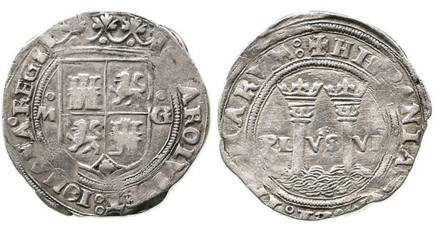 Mexico City, Mexico, 1 real, Charles-Joanna, "Late Series," assayer oG to right, mintmark oM to left, rare. N-unl (36 for type); S-M5; CT-142. 3.2 grams. Broad, thin flan with mostly bold legends (uneven strike), good crown and inner details, the unusual oM-oG rather clear (differing from N-36 in that the reverse legend is "c"), VF+ with some contrasting toning.