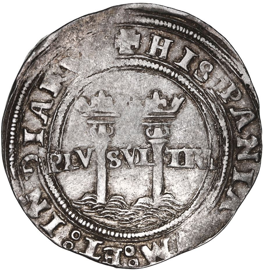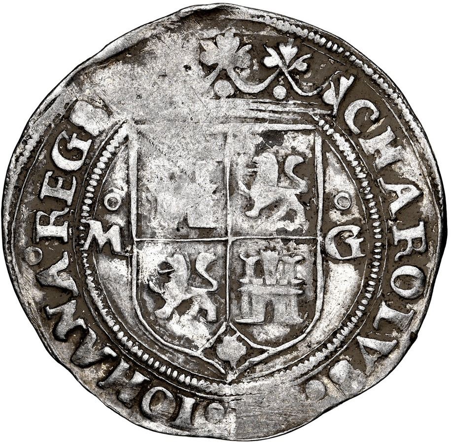 Mexico City, Mexico, 1 real, Charles-Joanna, "Late Series," assayer oG to right, mintmark oM to left (oM-oG), king's name as CHAROLVS, rare, NGC XF 40. Nesmith-36a; Cal-65; S-M5; KM-9. 3.43 grams. A slightly different type of oM-oG coin with the banner between the pillars reading PLV-SVL-TR (instead of the usual PL-VS-VL), this was a variety known to Nesmith who noted having seen two of them. Nicely struck with clear legends, slightly off-center but nonetheless important as an early emission from assayer G in the Late Series period, currently tied with three others for finest in the NGC census (including the previous lot). Pedigreed to the Clyde Hubbard Collection of Mexican Charles-Joanna Coinage (stated on label). Accompanied by original tag or holder.