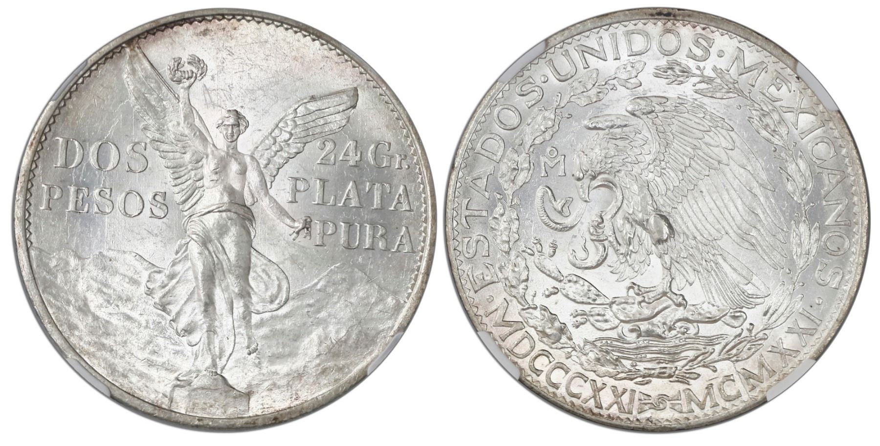 Mexico City, Mexico, 2 pesos, 1921, Independence centennial, NGC MS 63.