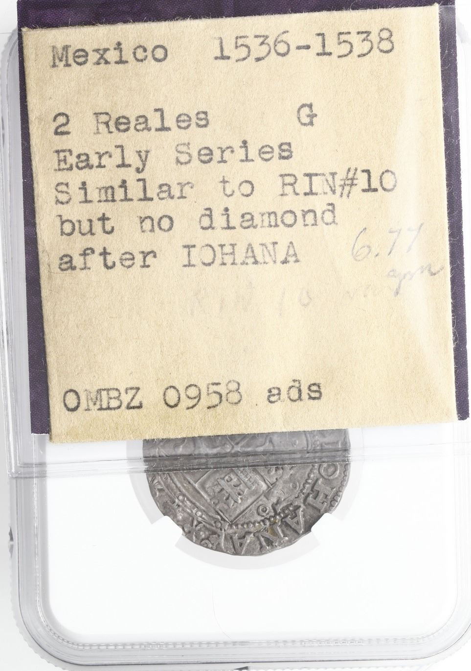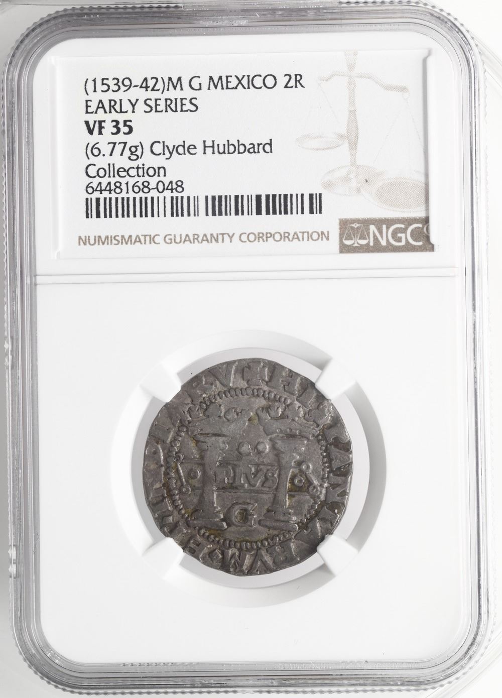 Mexico City, Mexico, 2 reales, Charles-Joanna, "Early Series," assayer G between bottoms of pillars, mintmark M to left and right (oMo-oMo), motto as PLVS in left-leaning rhomboid panel with single annulets on either side, rare, NGC VF 35. Nesmith-10a/10; Cal-88; S-M2; KM-unl (11 for type). 6.77 grams. A very nice example, purchased in 1958, after Nesmith's work came out, with a bold strike and virtually full legends, of the more-common variety (left-leaning panel vs. right-leaning panel), tiny gold spot on the pillars side. NGC #6448168-048. Pedigreed to the Clyde Hubbard Collection of Mexican Charles-Joanna Coinage (stated on label). Accompanied by original tag or holder from Clyde Hubbard.