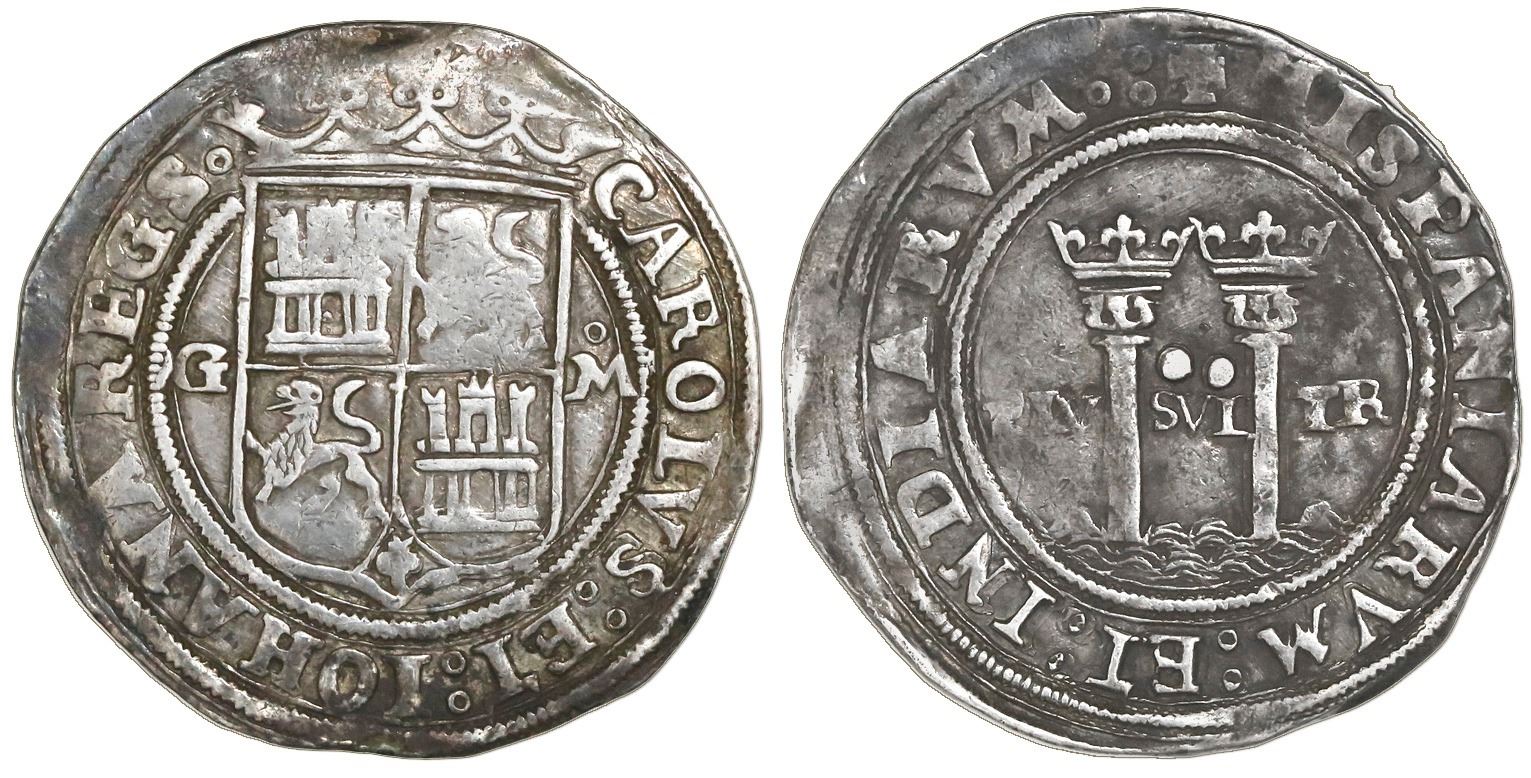 Mexico City, Mexico, 2 reales, Charles-Joanna, "Late Series," assayer G to left, mintmark oM to right (G-oM). Nesmith-41 type; CT-112; S-M5. 6.80 grams. Exceptionally broad flan that extends well beyond the outer border, good full details and toned throughout, XF, rare type with only 1/2 and 2 reales known.