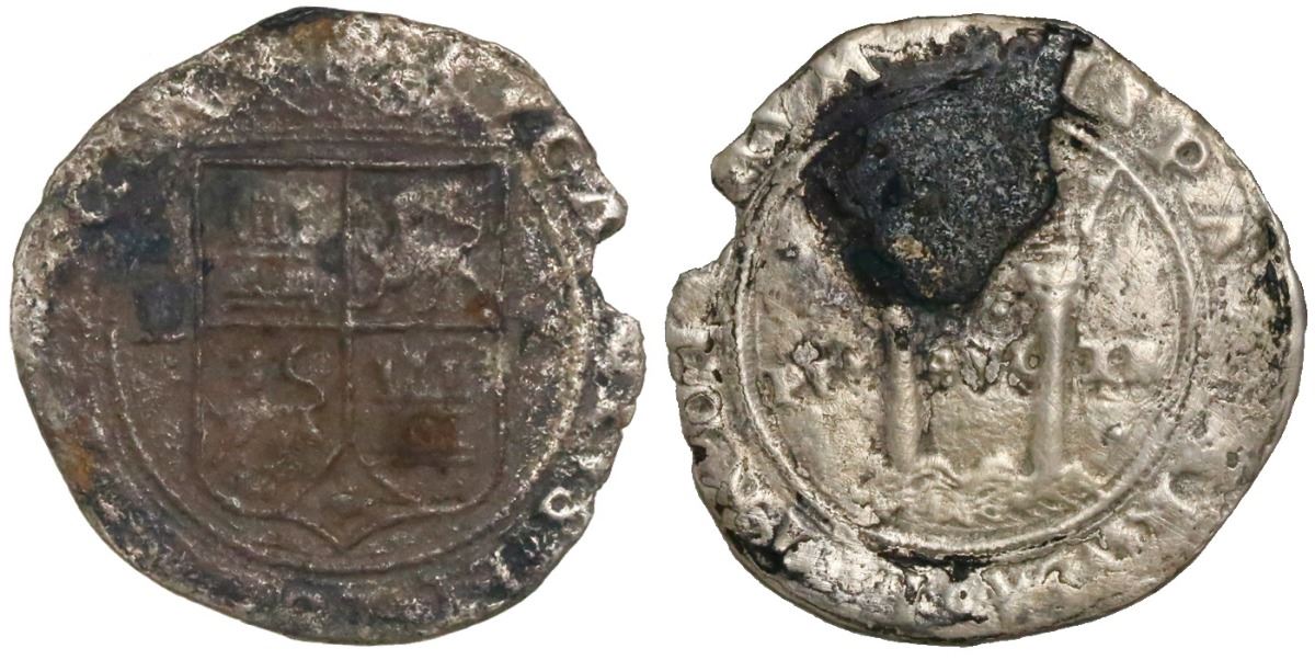 Mexico City, Mexico, 2 reales, Charles-Joanna, "Late Series," assayer L to left, mintmark M to right (L-M). Nesmith-81; CT-114, S-M9. 3.52 grams. Full shield and pillars but with about 80% of dark (and characteristic) "horn" silver removed from surface on pillars side, circular chip in rim. Pedigreed to the Charles Eidel collection. Recovered from: Spanish 1554 Fleet off Padre Island, Texas