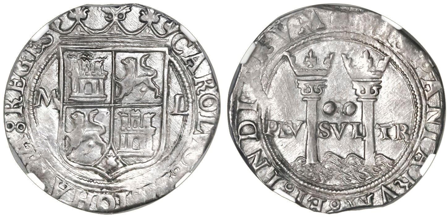 Mexico City, Mexico, 2 reales, Charles-Joanna, "Late Series," assayer L to right, mintmark M to left (M-L), NGC MS 62, finest known in NGC census, ex-Rudman. Nesmith-85 type; CT-116; S-M9. 6.8 grams. Choice bold inner details and nearly full legends, bright with luster (exceptional quality for this issue). Pedigreed to the Isaac Rudman collection. NGC #2789229-025.