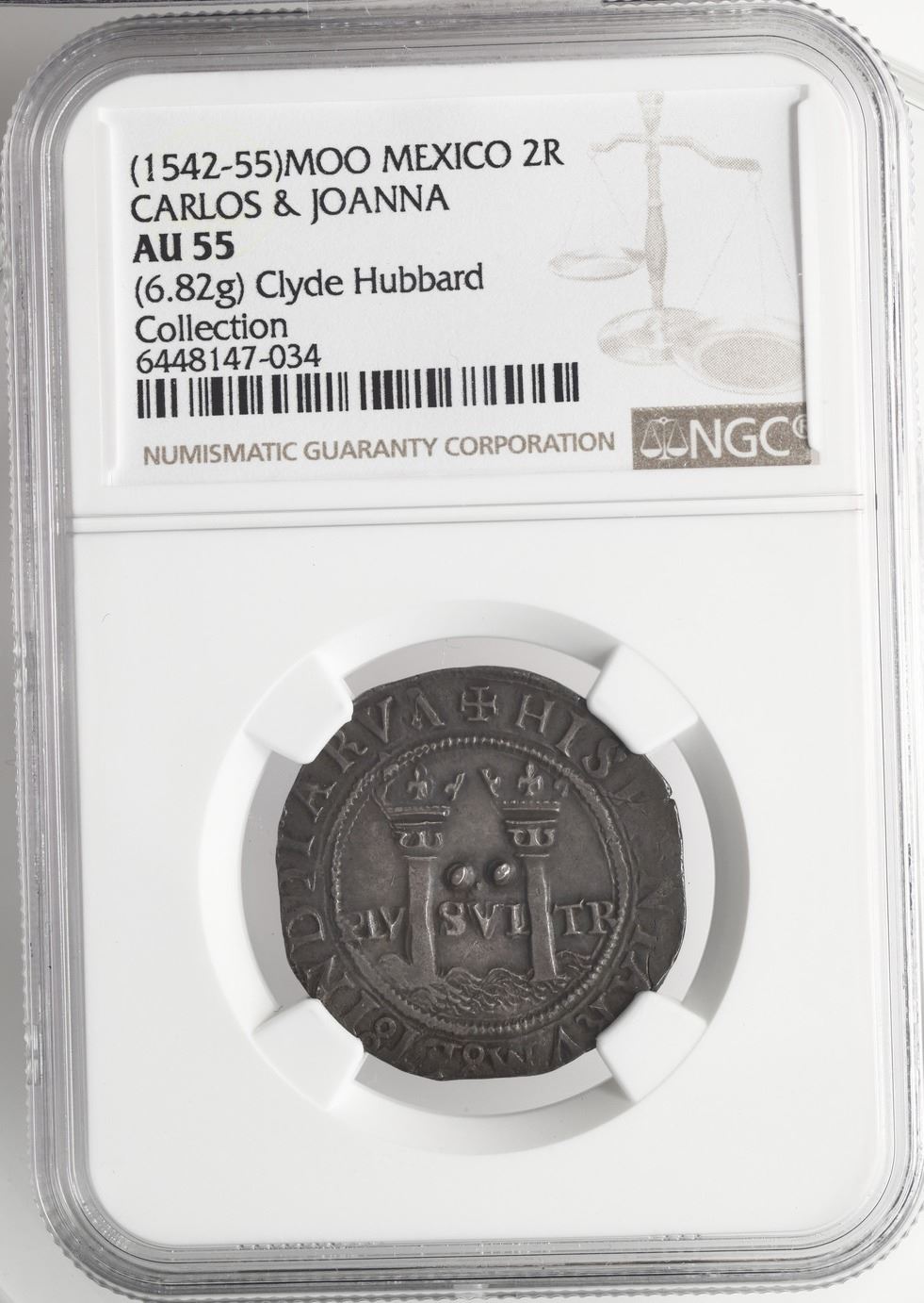Mexico City, Mexico, 2 reales, Charles-Joanna, "Late Series," assayer O to right, mintmark oM to left (oM-O), NGC AU 55. Nesmith-109; Cal-103; S-M10; KM-12. 6.82 grams. Very eye-appealing and struck on a broad flan with choice toning, no luster, virtually full details. While not rare, this is a nice specimen. NGC #6448147-034. Pedigreed to the Clyde Hubbard Collection of Mexican Charles-Joanna Coinage (stated on label) and to the Henry Christensen Auction of October 1959, lot 492. Accompanied by original tag or holder from Clyde Hubbard.