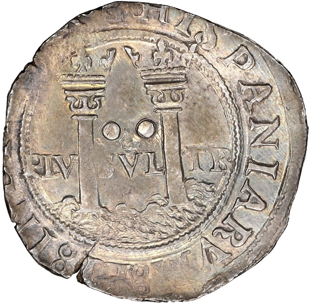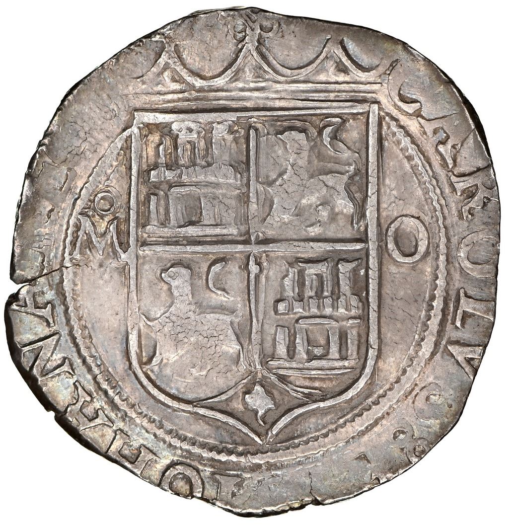 Mexico City, Mexico, 2 reales, Charles-Joanna, "Late Series," assayer O to right, mintmark oM to left (oM-O), NGC MS 63, finest known in NGC census. Nesmith-109; Cal-103; S-M10; KM-12. 6.67 grams. The single finest known in the NGC census above 23 other entries, including Hubbard's lot 452 above, this example with lovely details where visible (off-center strike prevents full legends), eye-catching iridescent toning, especially on pillars side, flan crack at 9 o'clock on shield side. NGC #6444905-002.