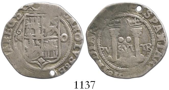 Mexico City, Mexico, 2 reales, Charles-Joanna, "Late Series," oM to left, O to right. S-M10; KM-12; CT-121. 6.4 grams. Nice Fine with mostly good details but two peripheral flat areas, holed at very edge, lightly toned.