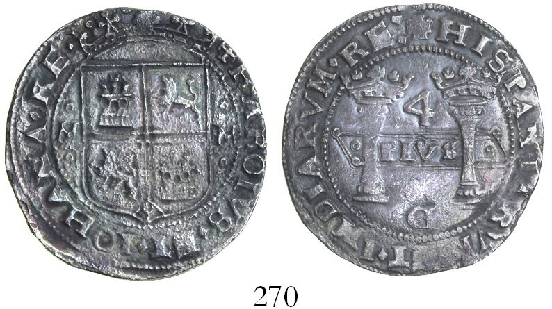 Mexico City, Mexico, 4 reales, Charles-Joanna, "Early Series," assayer G at bottom between pillars, left-leaning panel. Nesmith 11/11a; S-M2. 11.06 grams. Broad flan with full details (including legends), rich rainbow toning all over, minor surface corrosion on pillars side but a little more severe on the shield. Recovered from: "Golden Fleece wreck," sunk ca. 1550 in the northern Caribbean