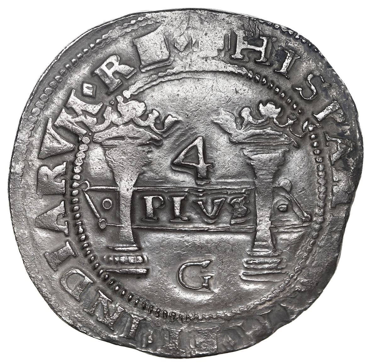 Mexico City, Mexico, 4 reales, Charles-Joanna, "Early Series," assayer G between bottoms of pillars, motto as PLVS in left-leaning rhomboid panel with single annulets on either side, rare. Nesmith 11 for type/11; Cal-119; S-M2; KM-17. 11.94 grams. Despite corrosion on shield side rendering the legend there very soft, this dark-toned specimen has AU details, with just one other like it known to us (not atypical of Early Series coinage). From: "Golden Fleece wreck," sunk ca. 1550 in the northern Caribbean
