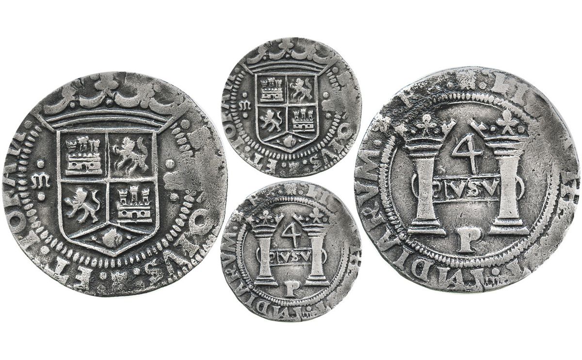 Mexico City, Mexico, 4 reales, Charles-Joanna, "Early Series," assayer P over erased Latin R at bottom between pillars, PLVSV in rounded panel, very rare. N-unl; S-M4; CT-70. 13.3 grams. Shield side with Gothic .m.-.m., legend as : KAROLVS : '/. : ET : IOhA|/| :; pillars side with Latin P/R below pillars, rounded panel with PLVSV behind pillars, Arabic 4 for denomination, legend as : '/. : HISPA|/|IE : ET : I|/|DIARVM : '/. RE. Bold VF+ with contrasting toning around details, nearly full legends, choice inner details. Note: Nesmith was not aware of this type with P (or P/R) on the pillars side. Pedigreed to the "Golden Fleece" wreck Research Collection (our Auction #4, lot 183).