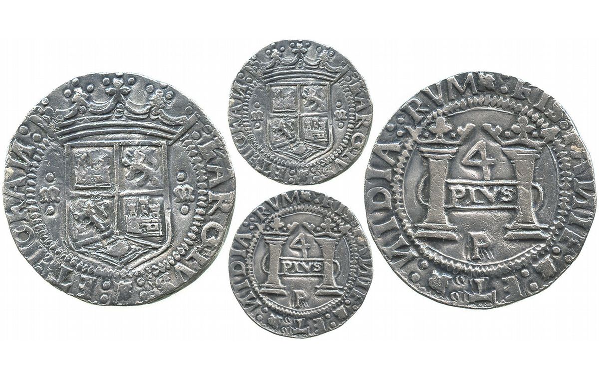 Mexico City, Mexico, 4 reales, Charles-Joanna, "Early Series," assayer P over erased Latin R at bottom between pillars, PLVS in rounded panel, very rare. N-unl; S-M4; CT-70. 13.4 grams. Shield side with Gothic .m.-.m., lions with crowns, legend as : KAROLVS : '/. : ET : IOhA|/| :; pillars side with Latin P/R below pillars, rounded panel with PLVS behind pillars, legend as '/. : HISPANIE : '/. : ET : '/. : |/|IDIA :. RVM. Beautifully rainbow-toned AXF with choice full legends and inner details, well centered and fully struck all over. Note: Nesmith was not aware of this type with P (or P/R) on the pillars side. Pedigreed to the "Golden Fleece" wreck Research Collection (our Auction #4, lot 182).