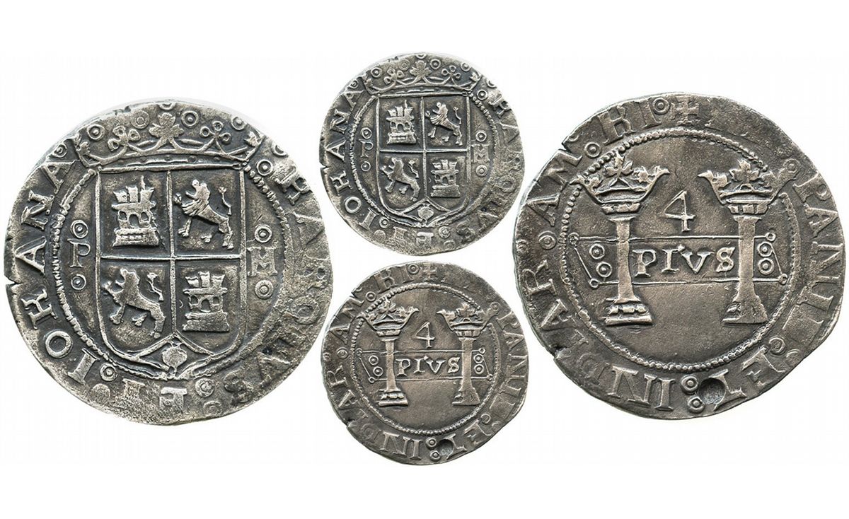 Mexico City, Mexico, 4 reales, Charles-Joanna, "Early Series," assayer P to left, mintmark M to right, PLVS in rhomboid panel, rare. N-21 (but no specimens known to him); S-M4; CT-77. 13.3 grams. Shield side with oPo-oMo with dots inside the o's (what Nesmith called "rondules-in-annulets"), with similar dots (but doubled, one on top of the other) in legends; left-leaning rhomboid panel with PLVS behind pillars, double (dotted) o's inside the panel outside the pillars, and plain annulets on the corners. Richly toned and well-centered XF with full legends and choice inner details, slightly weaker toward one side. Note: P-M is significantly rarer than M-P in 4R. Purchased from Lou Collins in 1971 as being from a "Florida land hoard."