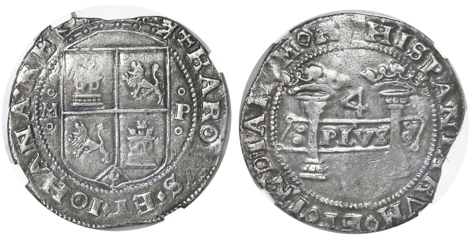 Mexico City, Mexico, 4 reales, Charles-Joanna, "Early Series," assayer P to right, mintmark oMo to left (oMo-oPo), NGC XF 45. Nesmith-26 for type/26a type; CT-75 type; S-M4 . Beautiful toning, choice details except for small interior weak spot, nearly full legends, tangential edge-void (as made) above shield, HISPANIARVM variety. NGC #3503561-003.
