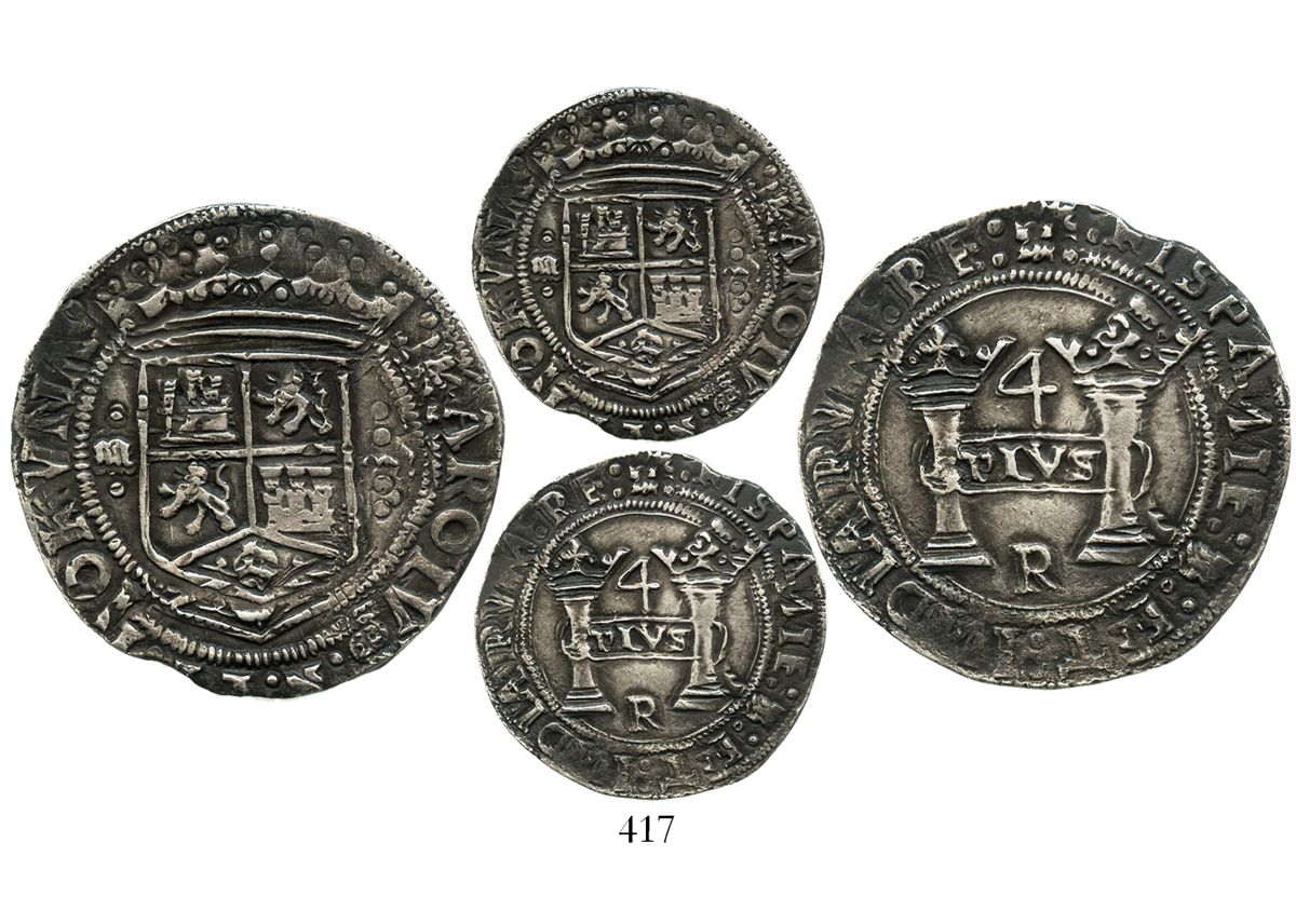 Mexico City, Mexico, 4 reales, Charles-Joanna, "Early Series," assayer R (Latin) at bottom between pillars, PLVS in rounded panel. Nesmith-6; S-M1; KM-16. 13.5 grams. Very broad flan with full legends (all Latin except for the letter H, which is Gothic) and choice, bold inner details, the shield slightly doubled but the pillars very impressive, corrosion-free and deeply toned with nice contrast. Pedigreed to our Auction #1 (lot #55), with Sedwick certificate from 2007. Recovered from: "Golden Fleece wreck," sunk ca. 1550 in the northern Caribbean