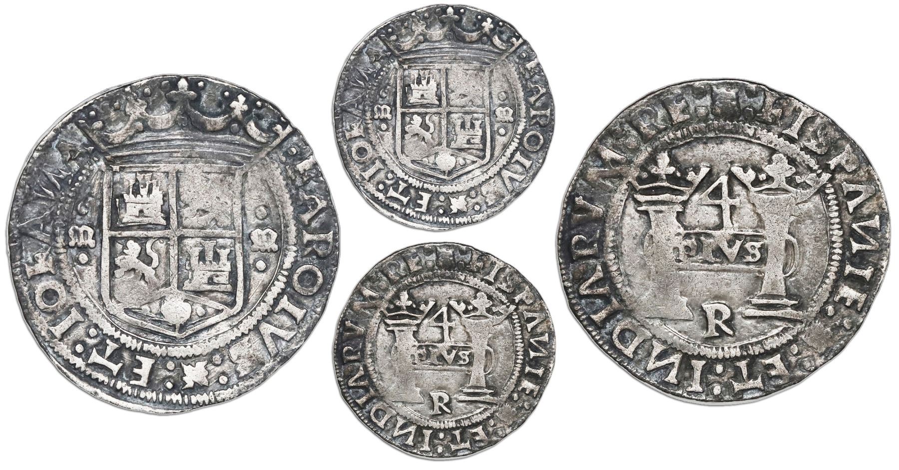 Mexico City, Mexico, 4 reales, Charles-Joanna, "Early Series," assayer R (Latin) at bottom between pillars, motto PLVS in rounded panel, NGC VF 35, ex-Potomac Collection (stated on label). Nesmith-6; Cal-115; S-M1; KM-16. 13.42 grams. Large, round flan with bold full legends on both sides (even the borders of dots outside the legends are visible), the assayer and denomination also very bold, with deep toning throughout, a lovely example all around for the grade. NGC #4762849-001. From the Potomac Collection, and pedigreed to the Pat Johnson Rare Coins sale of April 1972 (lot #13).