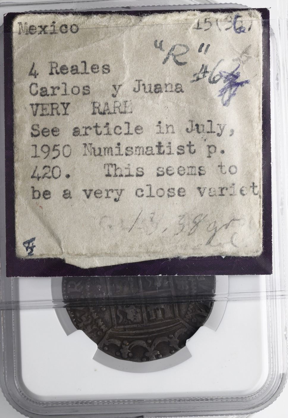 Mexico City, Mexico, 4 reales, Charles-Joanna, "Early Series," assayer R (Latin) between bottoms of pillars, motto as PLVS in rounded panel, NGC XF 40, Nesmith Plate Coin (drawing, no photo). Nesmith-6b; Cal-115; S-M1; KM-16. 13.38 grams. Not often do plate coins from Nesmith's book come to market and the added benefit of this one is that Nesmith's typewritten notes about the coin appear on the envelope in which the coin was kept for about 70 years. An example of the last of the rounded-panel coins to be struck before the use of a rhomboid panel, this specimen is well worth being a plate coin as it has choice toning with full legends and interiors with all Latin lettering including the assayer-mark R and retrograde N, second finest known in the NGC census behind a single AU 50. NGC #6448168-013. Pedigreed to the Clyde Hubbard Collection of Mexican Charles-Joanna Coinage (stated on label), plated as a drawing on page 70 of Robert Nesmith's The Coinage of the First Mint of the Americas at Mexico City, 1536-1572 (1955). Accompanied by original tag or holder from Clyde Hubbard.