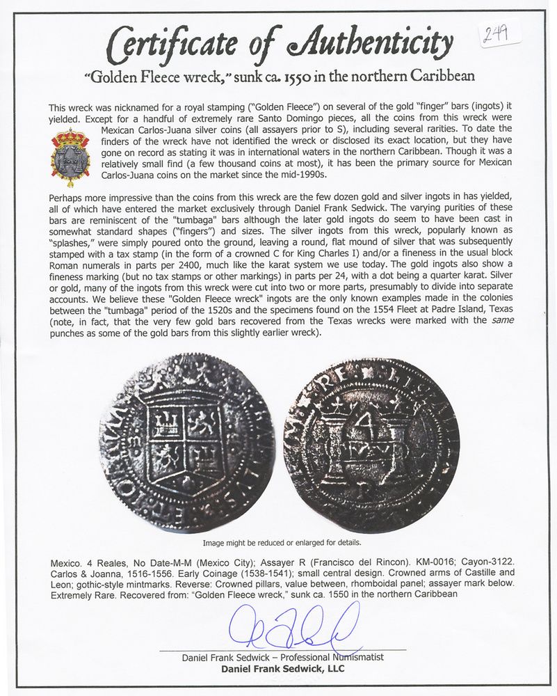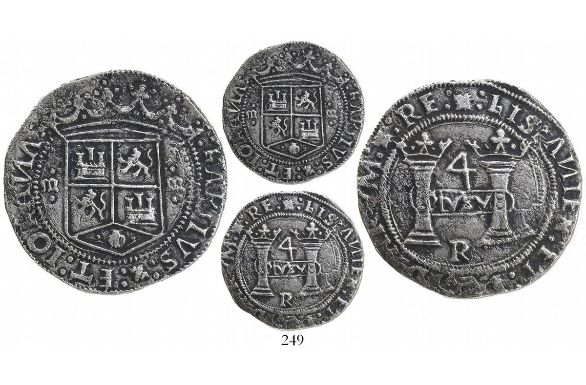 Mexico City, Mexico, 4 reales, Charles-Joanna, "Early Series," assayer R at bottom between pillars. Nesmith 6a/6c for type S-M1. 11.56 grams. Choice bold details all over (full legends, no doubling) but with very light surface corrosion and corresponding weight loss, still very attractive and great for study since so much die-detail is in evidence. With Sedwick photo-certificate, and pedigreed to the Richard A. Long auctions of October 1996 (lot 536) and October 1995 (lot 588). Recovered from: "Golden Fleece wreck," sunk ca. 1550 in the northern Caribbean