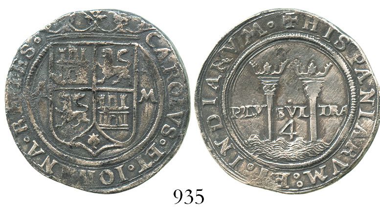 Mexico City, Mexico, 4 reales, Charles-Joanna, "Late Series," assayer A to left, mintmark M to right. Nesmith-62a; S-M6; KM-18. 13.4 grams. Full legends and excellent inner details, XF for grade but with very light surface corrosion on part of shield only, toned around details. From the "Golden Fleece wreck" (ca. 1550).