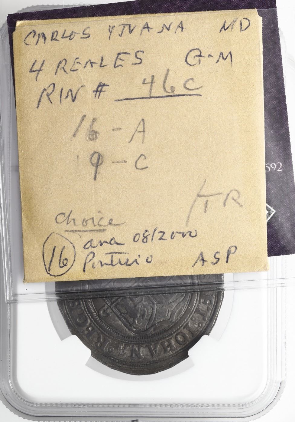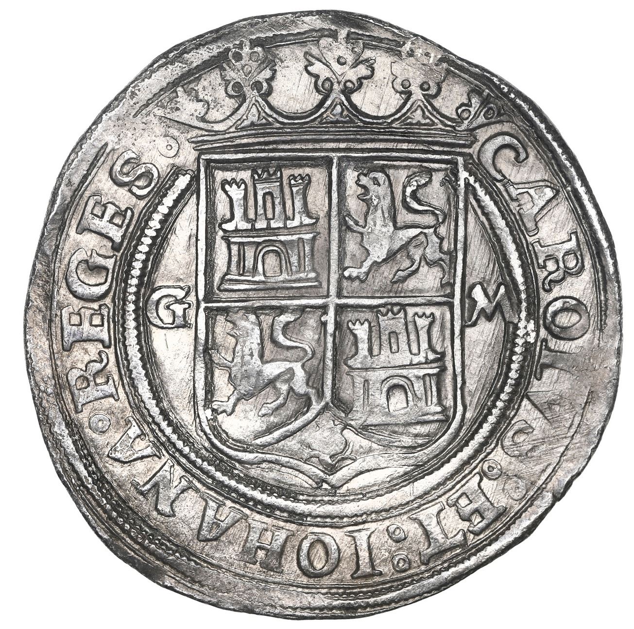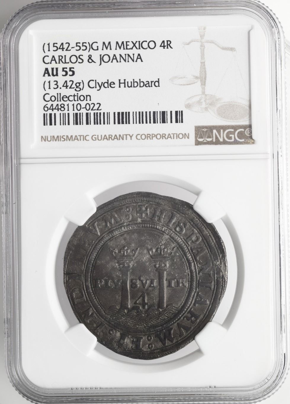 Mexico City, Mexico, 4 reales, Charles-Joanna, "Late Series," assayer G to left, mintmark M to right (G-M), NGC AU 55. Nesmith-46c type; Cal-128; S-M5; KM-18. 13.42 grams. Deeply toned on a broad flan (some extra metal outside the design area), full legends and details, unusual ending of banner between pillars showing TR instead of TRA, probably from the "Golden Fleece wreck" (ca. 1550). NGC #6448110-022. Pedigreed to the Clyde Hubbard Collection of Mexican Charles-Joanna Coinage (stated on label). Accompanied by original tag or holder from Clyde Hubbard.