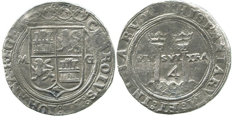Mexico City, Mexico, 4 reales, Charles-Joanna, "Late Series," assayer G to right, mintmark M to left, king's name as CHAROLVS. N-50; S-M5; CT-unl (60 for type). 13.1 grams. Full legends and inner details, all darkly toned with some light corrosion, the pillars oddly tilted toward each other slightly (engraved that way on the die). Recovered from: "Golden Fleece wreck," sunk ca. 1550 in the northern Caribbean