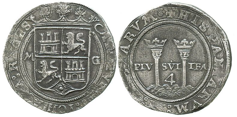 Mexico City, Mexico, 4 reales, Charles-Joanna, "Late Series," assayer G to right, mintmark M to left. N-50e; S-M5a; CT-81. 13.3 grams. Sharp details and choice contrast, full inner details and nearly full legends, light corrosion only. Recovered from: "Golden Fleece wreck," sunk ca. 1550 in the northern Caribbean