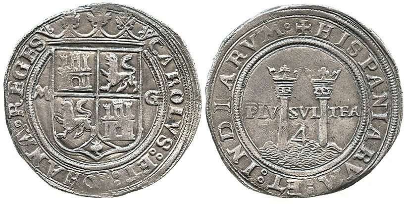 Mexico City, Mexico, 4 reales, Charles-Joanna, "Late Series," assayer G to right, mintmark M to left. N-50e; S-M5 or 5a; CT-81. 13.5 grams. Broad, round flan that extends beyond the full legends, choice full inner details, attractively old-toned XF+, struck slightly off-center.
