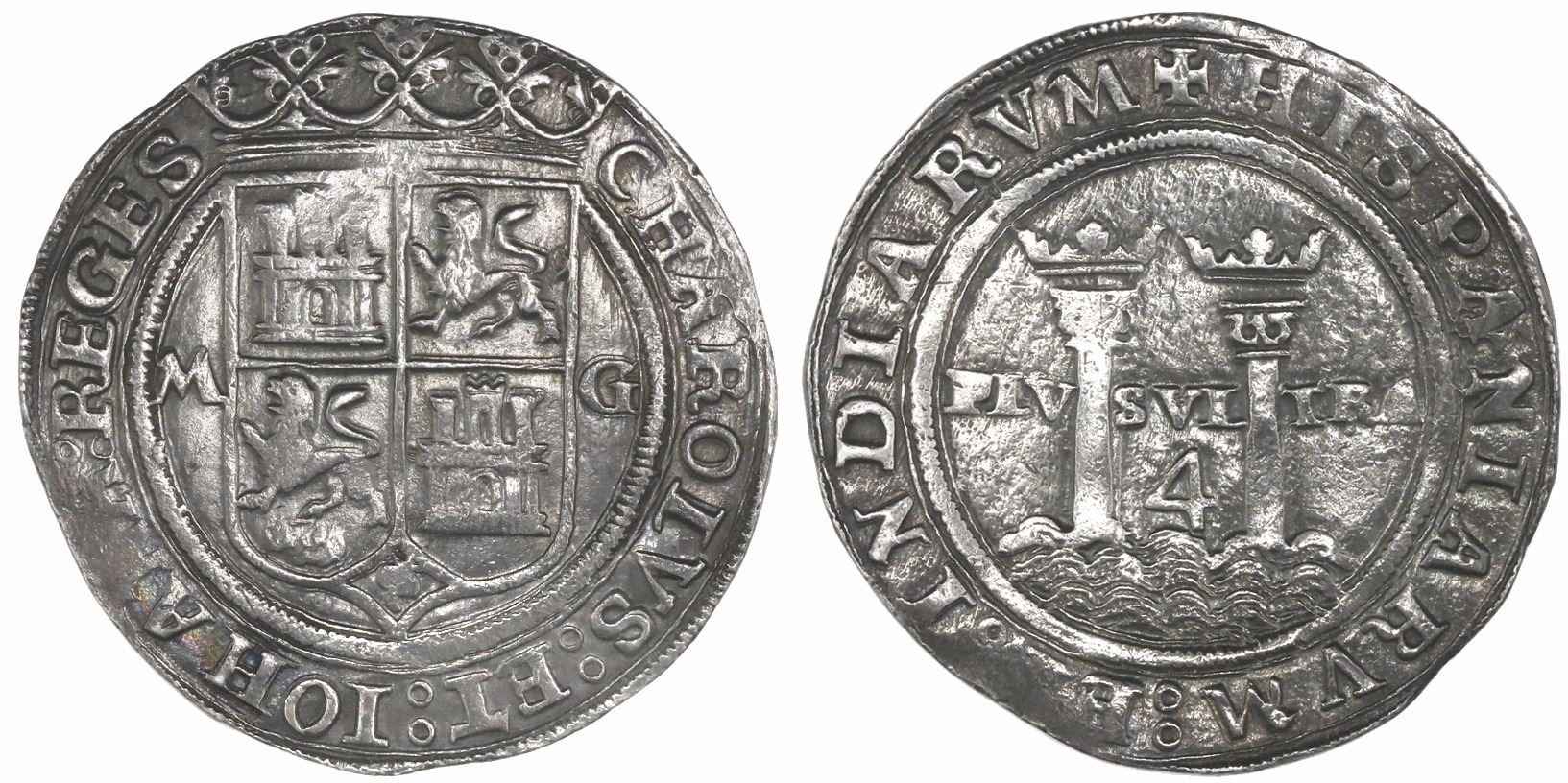 Mexico City, Mexico, 4 reales, Charles-Joanna, "Late Series," assayer G to right, mintmark M to left (M-G). Nesmith-50a type; CT-81; S-M5. 13.65 grams. CH variety. Richly toned AU, broad flan with full legends and choice inner details, no corrosion but possibly salvaged. NGC #3351341-007. With NGC tag #3351341-007 showing grade of AU 55.