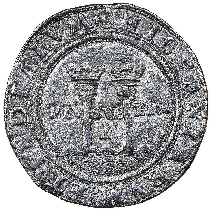 Mexico City, Mexico, 4 reales, Charles-Joanna, "Late Series," assayer G to right, mintmark M to left (M-G), king's name as CHAROLVS, NGC XF 45. Nesmith-50 type; Cal-125; S-M5. 13.51 grams. Lovely steel-gray toning with bluish highlights, full legends and inner details, a desirable early type from the "Late Series" coinage. NGC #5938911-003. From: "Golden Fleece wreck," sunk ca. 1550 in the Northern Caribbean