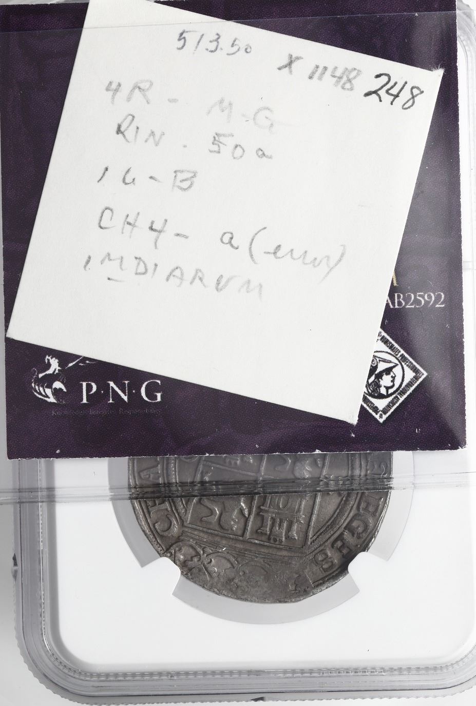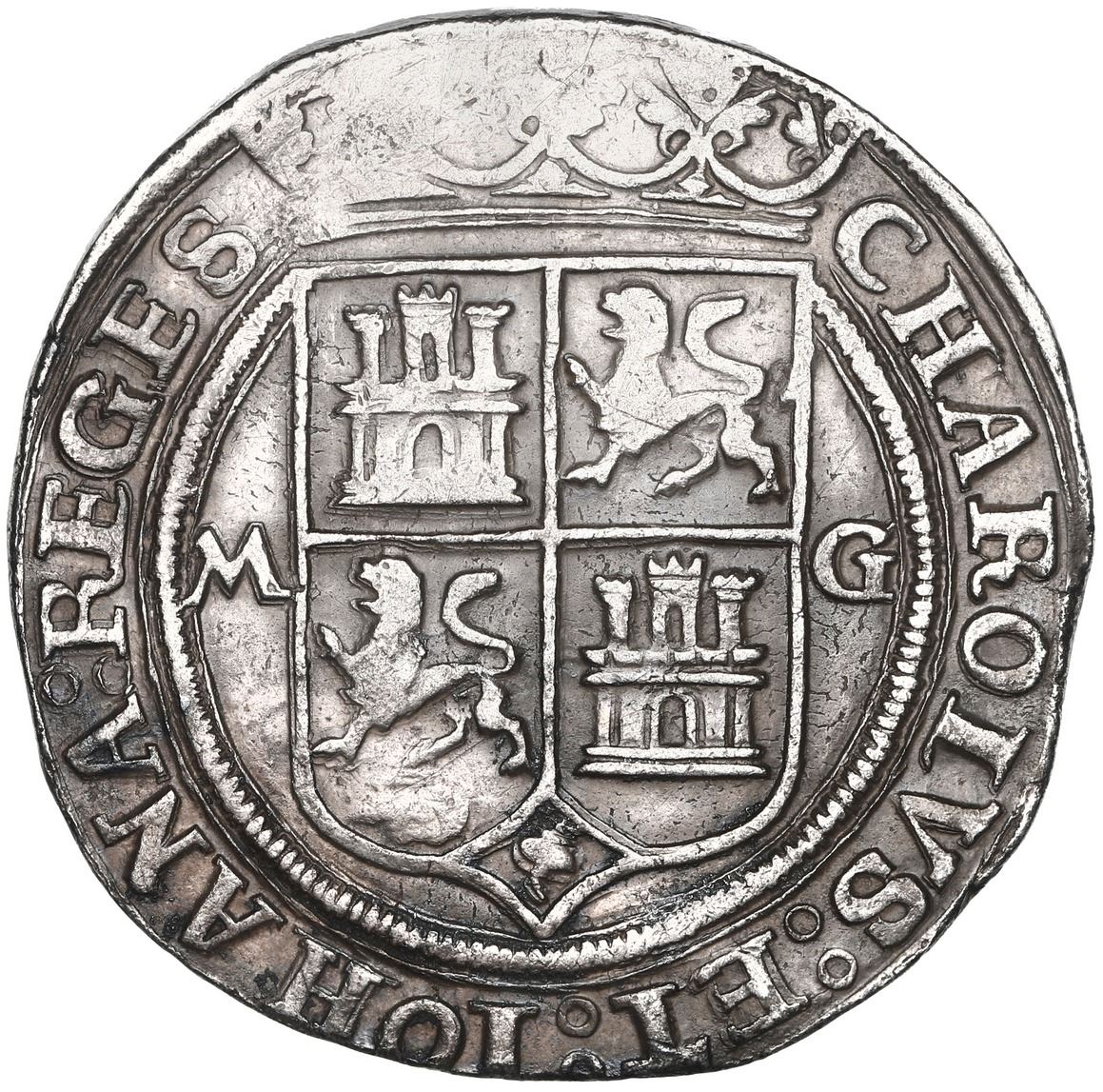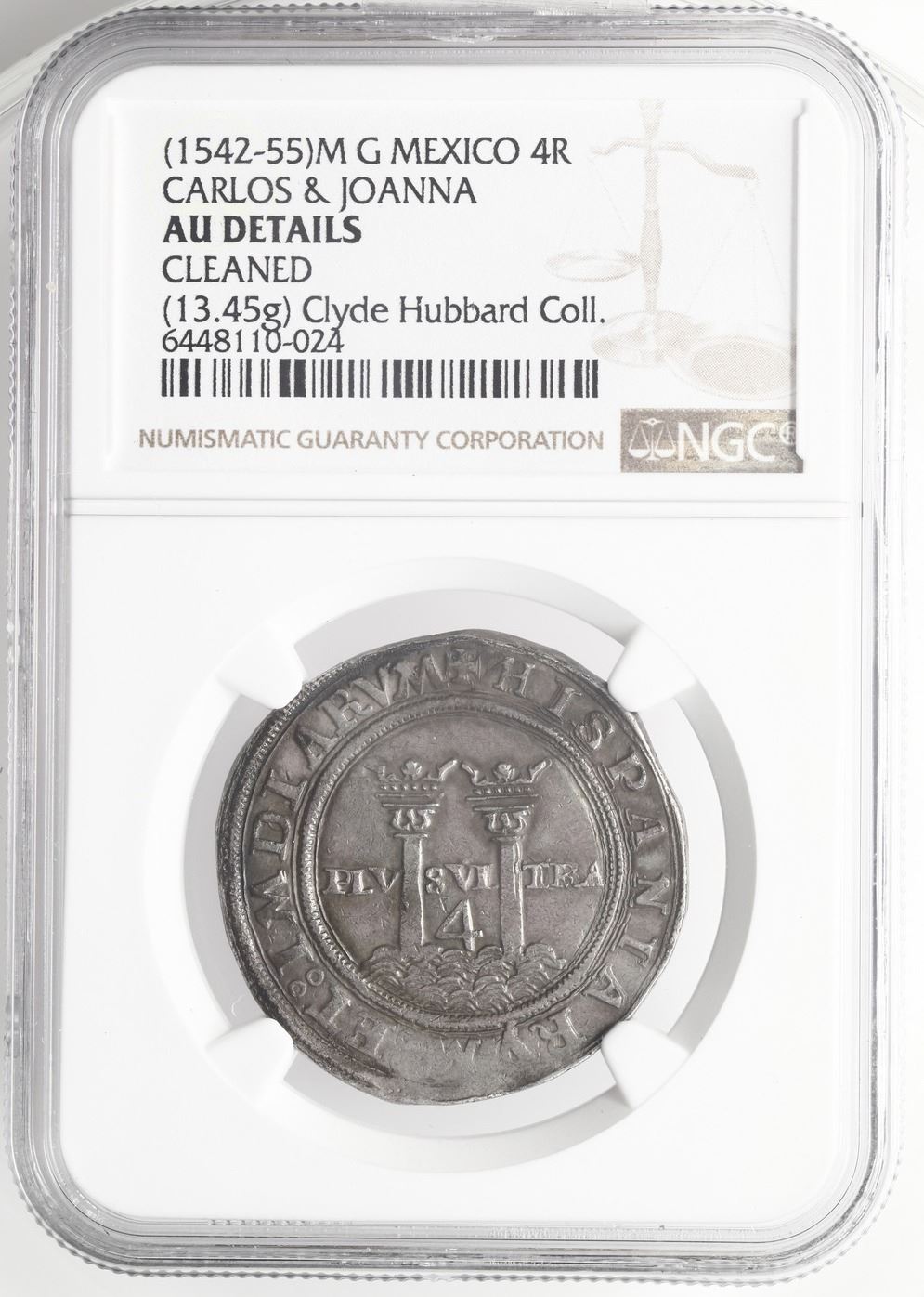 Mexico City, Mexico, 4 reales, Charles-Joanna, "Late Series," assayer G to right, mintmark M to left (M-G), king's name as CHAROLVS, NGC AU details / cleaned. Nesmith-50 for type; Cal-125; S-M5; KM-18. 13.45 grams. A rare error coin from the Mexico City mint, with IMDIARVM instead of INDIARVM on the pillars legend, only found on a few coins early in this assayer's tenure, with the king's name as CHAROLVS. Full-flan example with complete legends, lightly toned. NGC #6448110-024. Pedigreed to the Clyde Hubbard Collection of Mexican Charles-Joanna Coinage (stated on label) and to the Richard Long Auction of May 1996 (lot 248). Accompanied by original tag or holder from Clyde Hubbard.