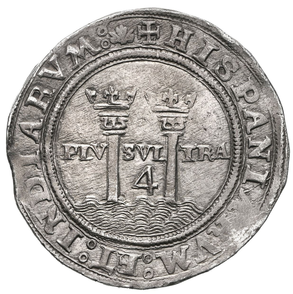 Mexico City, Mexico, 4 reales, Charles-Joanna, "Late Series," assayer G to right, mintmark M to left (M-G), king's name as CHAROLVS, NGC AU 58. Nesmith-50f type; Cal-125; S-M5; KM-18. 13.57 grams. Well struck on a broad flan with complete legends, an early issue from this assayer with the king's name as CHAROLVS, pillars-side legend ending in a trefoil or flower, which is very rare and only from this assayer, probably from the "Golden Fleece wreck" (ca. 1550). NGC #6448110-030. Pedigreed to the Clyde Hubbard Collection of Mexican Charles-Joanna Coinage (stated on label). Accompanied by original tag or holder from Clyde Hubbard.