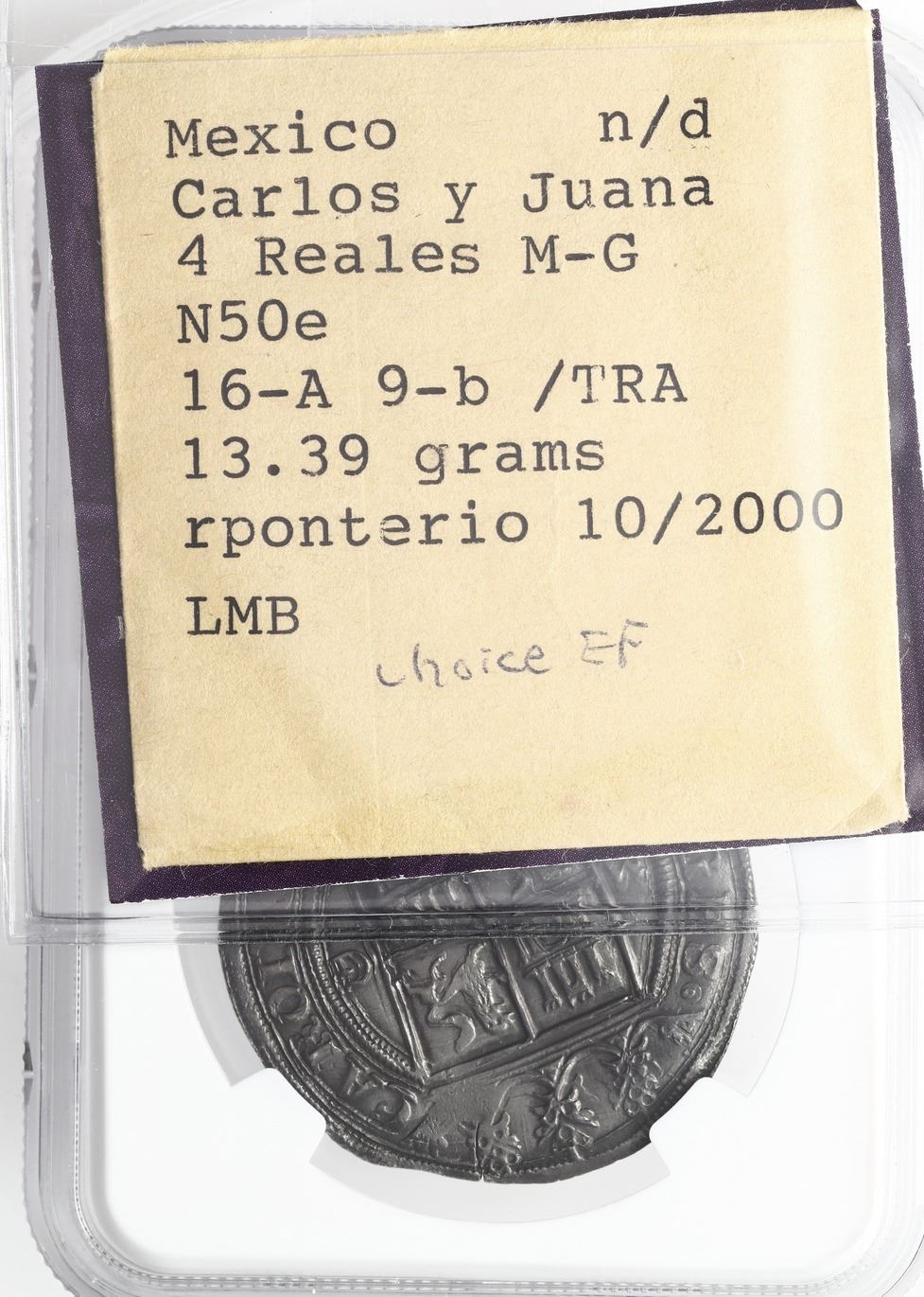 Mexico City, Mexico, 4 reales, Charles-Joanna, "Late Series," assayer G to right, mintmark M to left (M-G), NGC MS 62. Nesmith-50e type; Cal-127; S-M5; KM-18. 13.37 grams. Hard to find a nicer example, from the beautiful chocolate toning to the extra large flan (metal extends well outside the design in some areas), to the crisp, clear details throughout, second highest grade in the NGC census. This is a prize for the discerning collector. NGC #6448110-029. Pedigreed to the Clyde Hubbard Collection of Mexican Charles-Joanna Coinage (stated on label). Accompanied by original tag or holder from Clyde Hubbard.