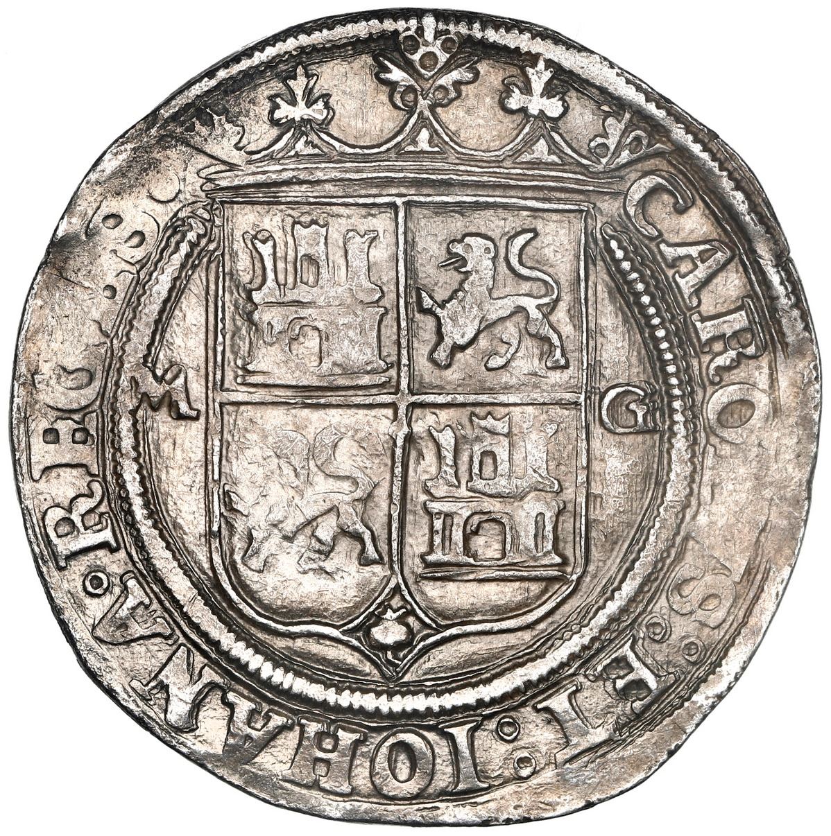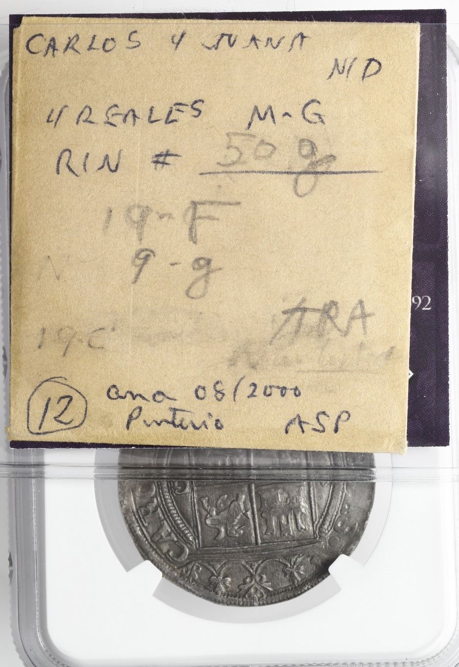 Mexico City, Mexico, 4 reales, Charles-Joanna, "Late Series," assayer G to right, mintmark M to left (M-G), NGC AU 58. Nesmith-50g type; Cal-127; S-M5; KM-18. 13.64 grams. Lightly toned on a broad flan with full details and the curious trefoil or flower appearing at the end of the pillars-side legend (used only by this assayer), probably from the "Golden Fleece wreck" (ca. 1550). NGC #6448110-035. Pedigreed to the Clyde Hubbard Collection of Mexican Charles-Joanna Coinage (stated on label). Accompanied by original tag or holder from Clyde Hubbard.