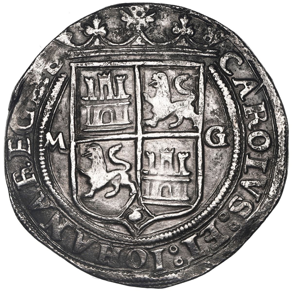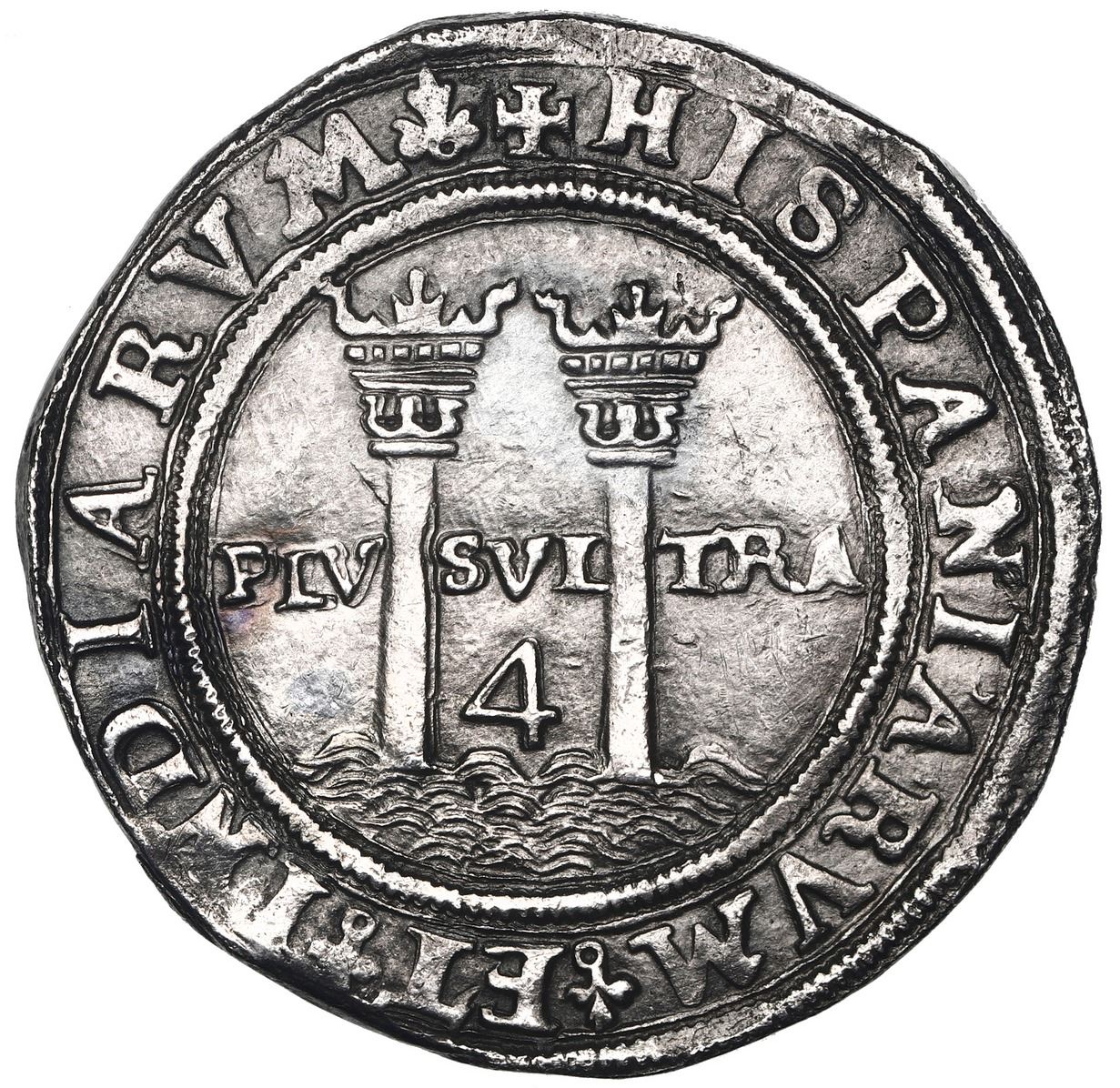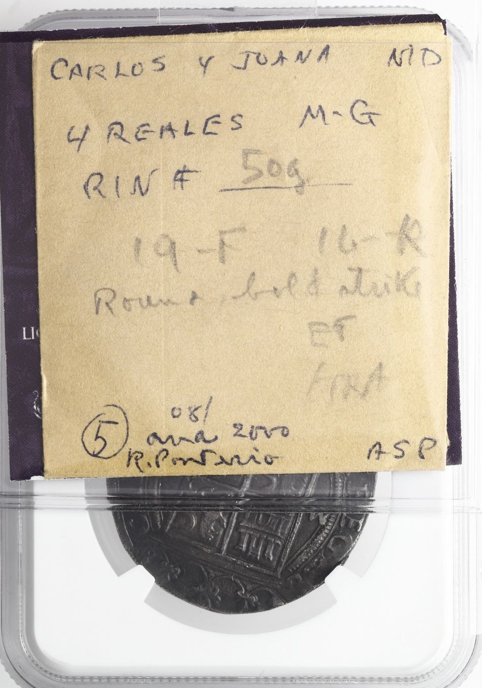 Mexico City, Mexico, 4 reales, Charles-Joanna, "Late Series," assayer G to right, mintmark M to left (M-G), NGC UNC details / cleaned. Nesmith-50g type; Cal-127; S-M5; KM-18. 13.57 grams. Struck slightly off-center on a broad flan, lots of eye appeal with contrasting toning, no clear signs of cleaning despite the grade, interesting trefoils or flowers used as stops between words in the pillars-side legend (used only by this assayer) and more than likely from the "Golden Fleece wreck" (ca. 1550). NGC #6448110-036. Pedigreed to the Clyde Hubbard Collection of Mexican Charles-Joanna Coinage (stated on label). Accompanied by original tag or holder from Clyde Hubbard.