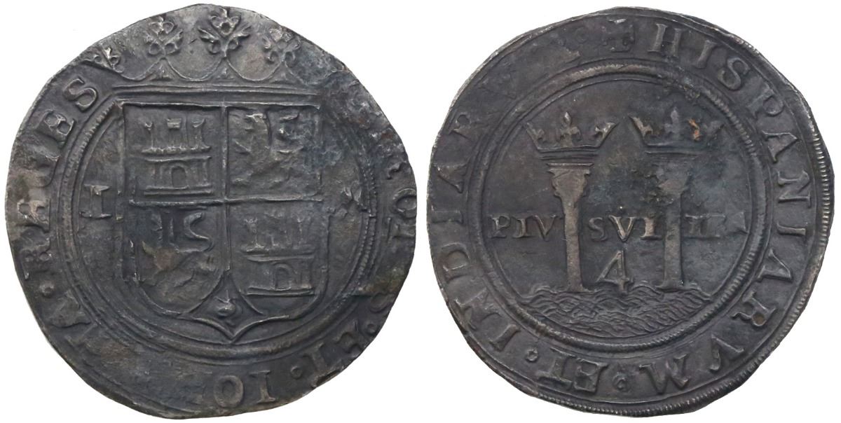 Mexico City, Mexico, 4 reales, Charles-Joanna, "Late Series," assayer L to left, mintmark M to left (L-M). Nesmith-82; S-M9; CT-86. 13.19 grams. Very darkly toned AU with full details, traces of surface corrosion in spots as from unspecified salvage.