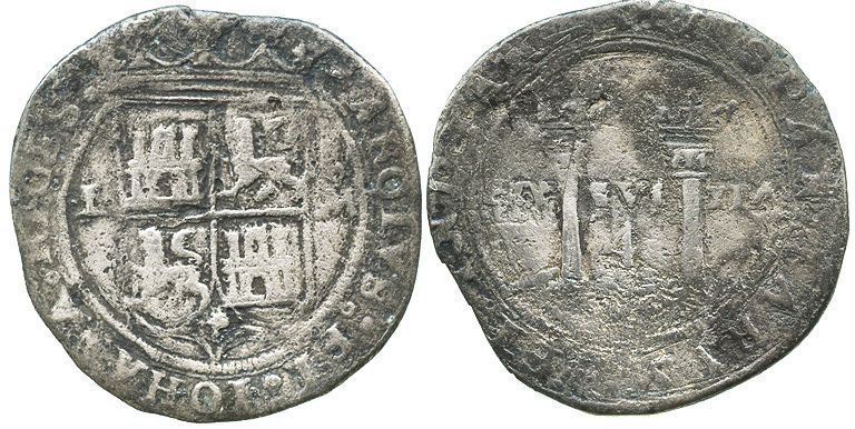 Mexico City, Mexico, 4 reales, Charles-Joanna, "Late Series," assayer L to left, mintmark M to right. N-94 for type; S-M10; CT-86. 11.5 grams. Good full pillars and shield despite pitting and corrosion all over, the legends nearly full too, mostly darkly toned. Recovered from: Spanish 1554 Fleet off Padre Island, Texas