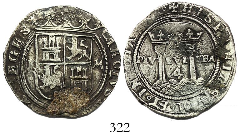 Mexico City, Mexico, 4 reales, Charles-Joanna, "Late Series," assayer L to left, mintmark M to right. Nesmith-82; S-M9; KM-18 ;CT-86. 13.34 grams. Full pillars and shield (VF details), full crown and most of legends, minimal corrosion, with contrasting toning and patch of encrustation at bottom of shield. Recovered from: Unidentified ca.-1554 wreck off Santo Domingo, Dominican Republic