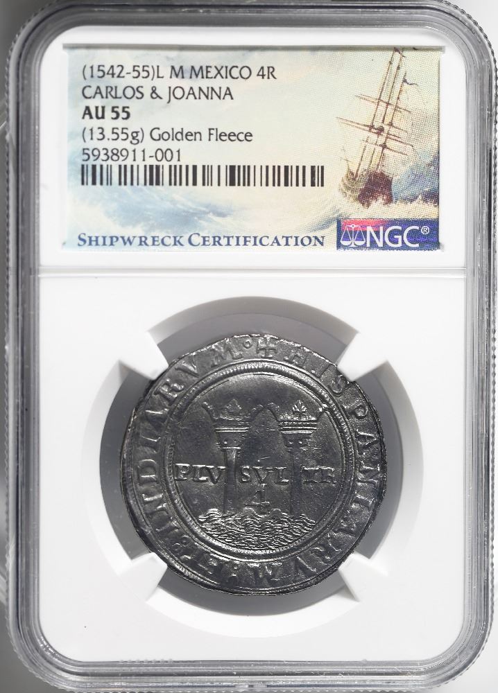 Mexico City, Mexico, 4 reales, Charles-Joanna, "Late Series," assayer L to left, mintmark M to right (L-M), NGC AU 55. Nesmith-82a type; Cal-136; S-M9. 13.55 grams. High grade for both assayer and shipwreck, deeply toned with full legends and inner details. NGC #5938911-001. From: "Golden Fleece wreck," sunk ca. 1550 in the Northern Caribbean