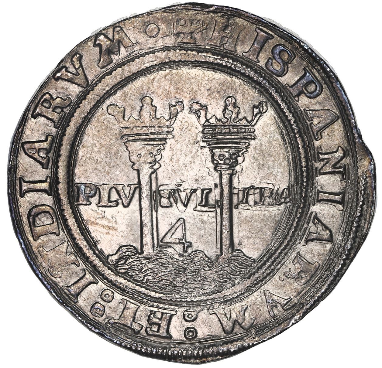 Mexico City, Mexico, 4 reales, Charles-Joanna, "Late Series," assayer L to right, mintmark M to left (M-L), NGC MS 62. Nesmith-86; Cal-135; M-9; KM-18. 13.52 grams. Tied with six others for finest in the NGC census, this deeply toned gem boasts well-struck legends and interiors on a full flan, devoid of corrosion despite its probably being from the "Golden Fleece wreck" (ca.1550). Pedigreed to the Clyde Hubbard Collection of Mexican Charles-Joanna Coinage (stated on label). Accompanied by original tag or holder.