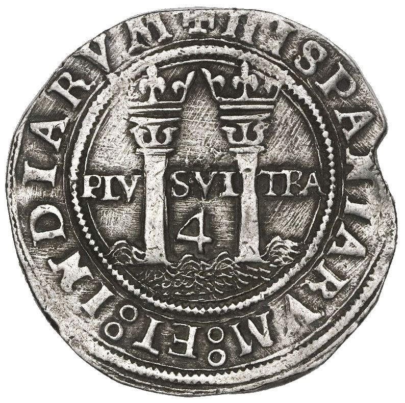 Mexico City, Mexico, 4 reales, Charles-Joanna, "Late Series," assayer O/L to left, mintmark oM to right (O/L-oM). Nesmith-106 type; Cal-139, S-M10; KM-18. 13.69 grams. Very rare overassayer with none known to Nesmith in this denomination and first we have seen, a choice VF example with nice toning around details, some loss of metal on one edge, overall very well struck unlike most coins from assayer O (more typical of L).