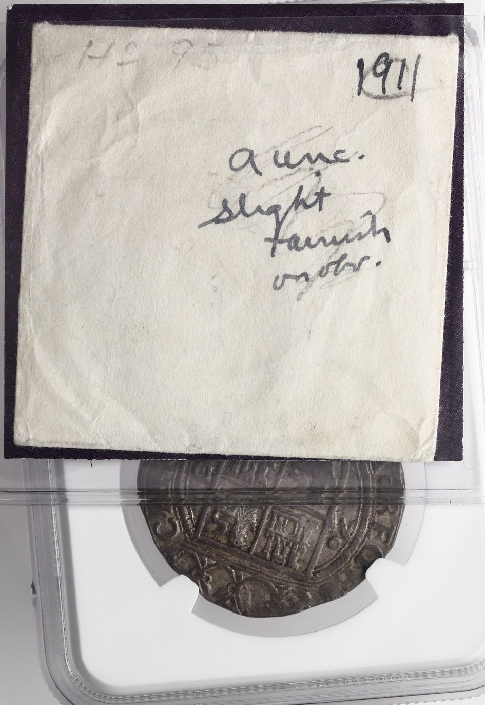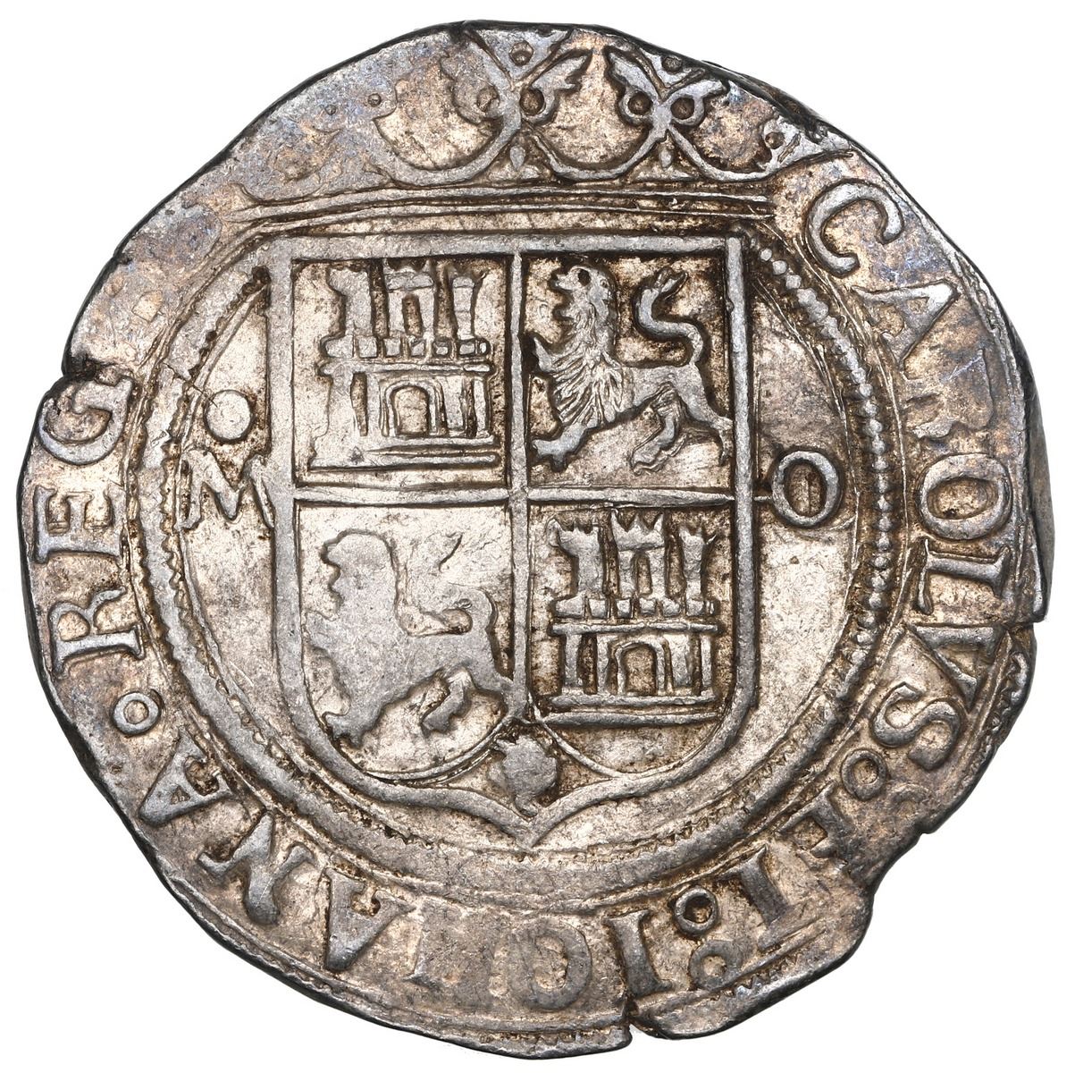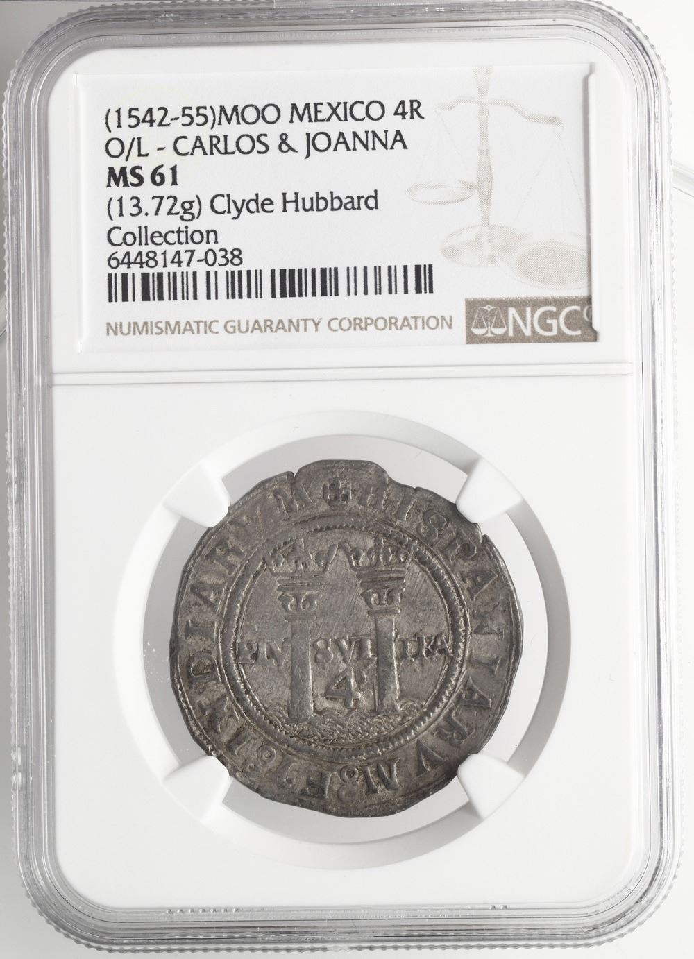 Mexico City, Mexico, 4 reales, Charles-Joanna, "Late Series," assayer O/L to right, mintmark oM to left (oM-O/L), NGC MS 61, finest known in NGC census. Nesmith-110a; Cal-unl; S-M10; KM-18. 13.72 grams. Beautifully toned and full of luster and frosty field, struck on a broad flan and well centered, this specimen is rare as oM-O/L but not unknown to Nesmith. In fact, one of the examples he cites may well have been this coin, given that Hubbard wrote "coll" on the coin envelope, indicating the piece was part of the hoard from the Lady of Guadalupe shrine which Nesmith knew about and had access to catalog. NGC #6448147-038. Pedigreed to the Clyde Hubbard Collection of Mexican Charles-Joanna Coinage (stated on label). Accompanied by original tag or holder from Clyde Hubbard.