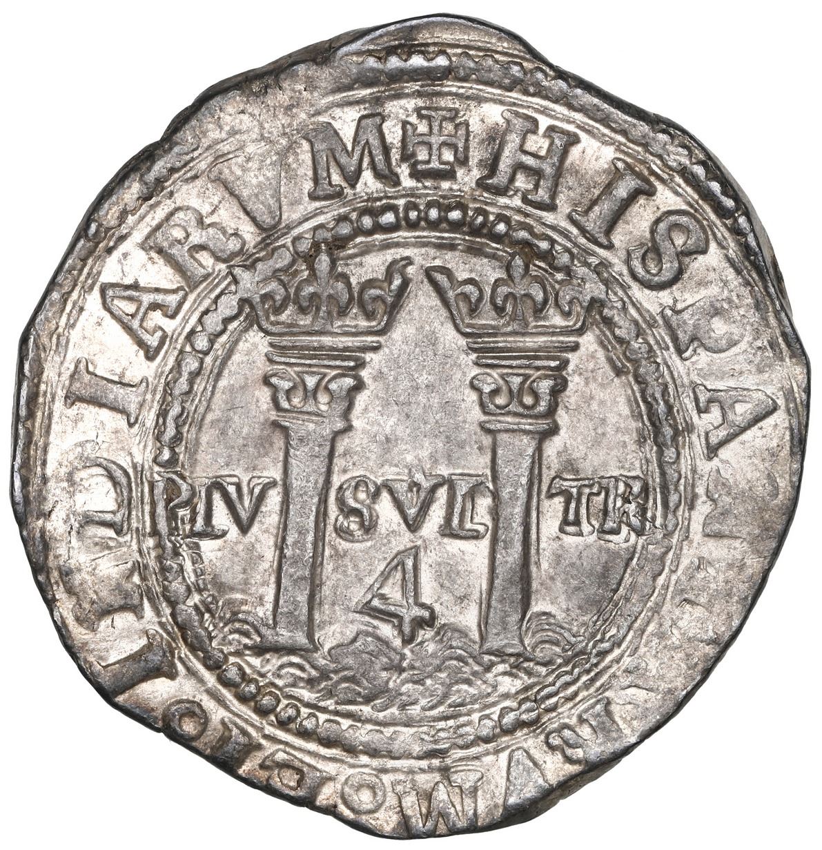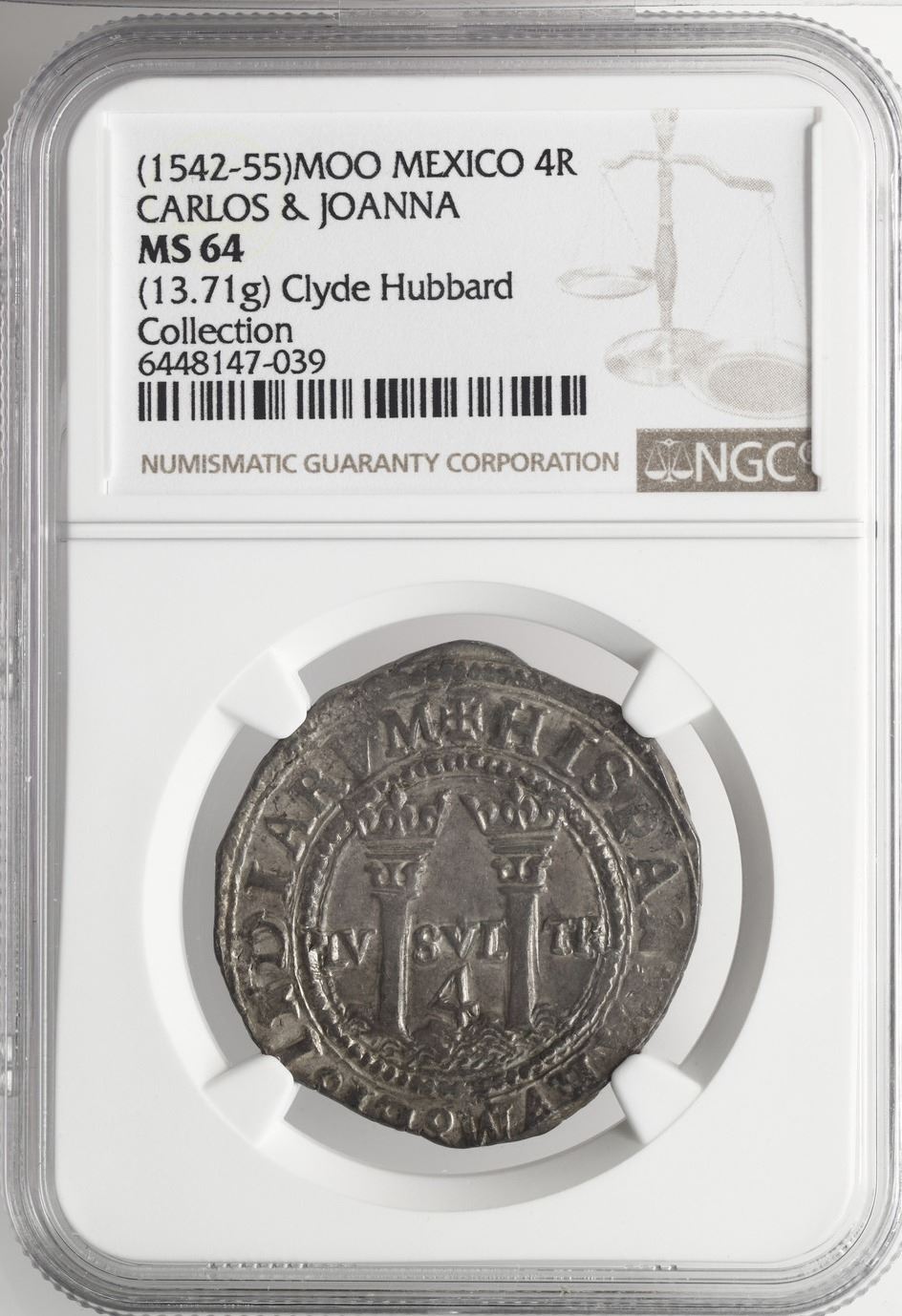 Mexico City, Mexico, 4 reales, Charles-Joanna, "Late Series," assayer O to right, mintmark oM to left (oM-O), NGC MS 64, finest known in NGC census. Nesmith-110; Cal-138; S-M10; KM-18. 13.71 grams. While Nesmith reported seeing hundreds of this variety, he probably never saw one as nice as this coin whose grade reflects its beauty, strike, and luster, all on a broad flan with sharp details and almost complete legends--a prize coin for any collection. Note the banner spelling ending in TR as well. In the NGC census, this coin stands out in front of a crowd of 28 other examples that top out at MS 62. NGC #6448147-039. Pedigreed to the Clyde Hubbard Collection of Mexican Charles-Joanna Coinage (stated on label). Accompanied by original tag or holder from Clyde Hubbard.