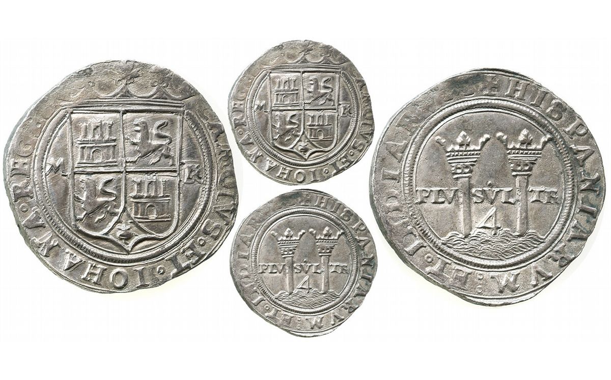 Mexico City, Mexico, 4 reales, Charles-Joanna, "Late Series," assayer R to right, mintmark M to left, very rare. N-70; S-M7; CT-unl. 13.5 grams. Broad-flan AU with light toning, full and bold inner details and virtually full legends, a choice example of this variety (M-R), which Nesmith listed but had no examples of. Pedigreed to the Kent Ponterio collection (Ponterio auction of August, 2009, lot #9155).