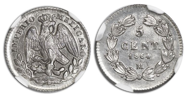 Mexico City, Mexico, 5 centavos, 1864-M, NGC MS 63+. ,KM-385.1. Choice strike all over, with strong luster at rims, an exceptional specimen of a brief type. NGC #4736235-003.