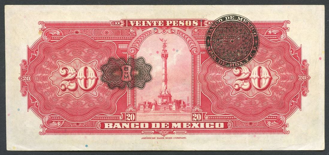 Mexico City, Mexico, Banco de Mexico, 20 pesos, ND (1925-34), series I. Frampton-M4617h; SCWPM-23h. Serial 1581782. Crisp XF with light folds and two holes in center.