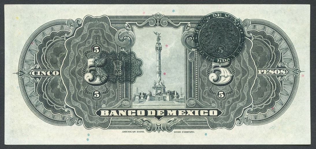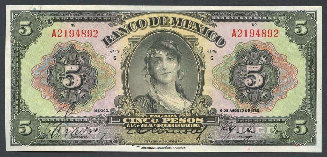 Mexico City, Mexico,, Banco de Mexico, 5 pesos, 9-8-1933, series G. Frampton-M4615f; SCWPM-21f. Serial A2194892. Choice UNC on crisp paper with bold embossing and strong paper wave.