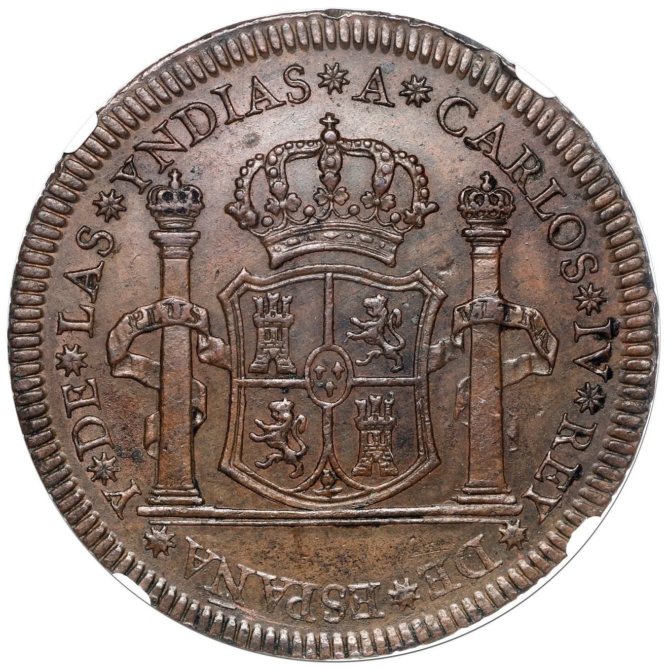 Mexico City, Mexico, bronze 4 reales proclamation medal, Charles IV, 1789, rare, NGC AU 55 Brown, finest and only example in NGC census. Grove-C10a; Cal-792. Well struck but dark in color and lacking luster, minimal high-point wear, a few very light obverse rim-bruises.