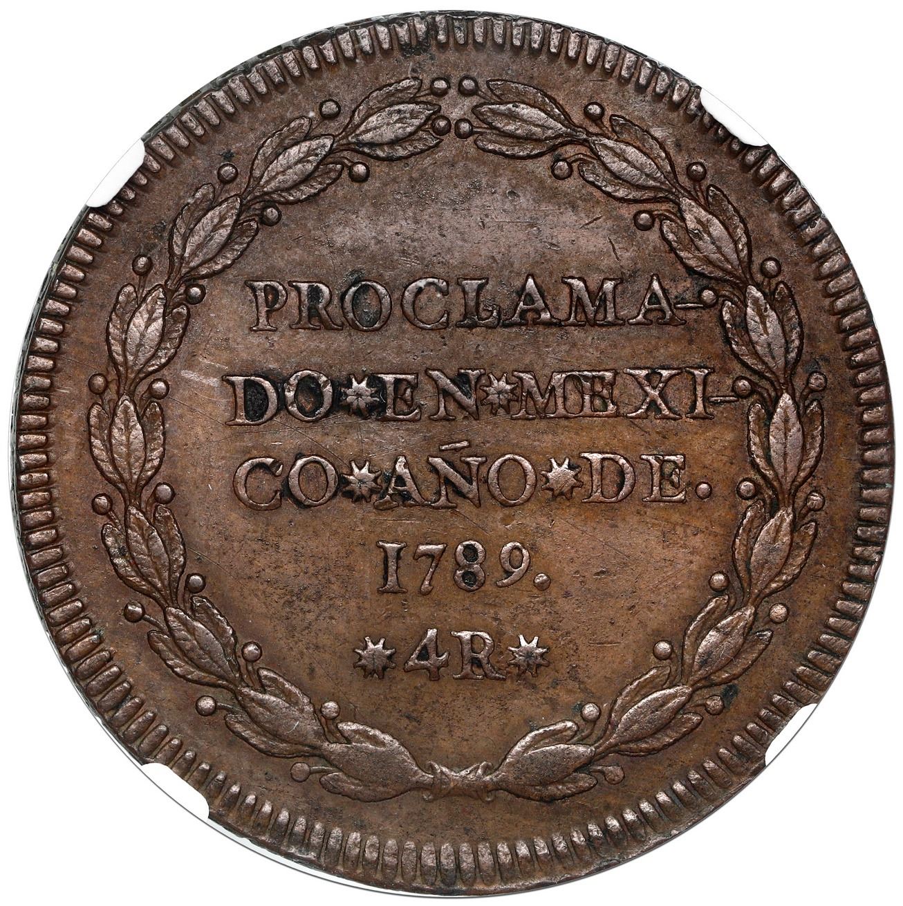 Mexico City, Mexico, bronze 4 reales proclamation medal, Charles IV, 1789, rare, NGC AU 55 Brown, fi