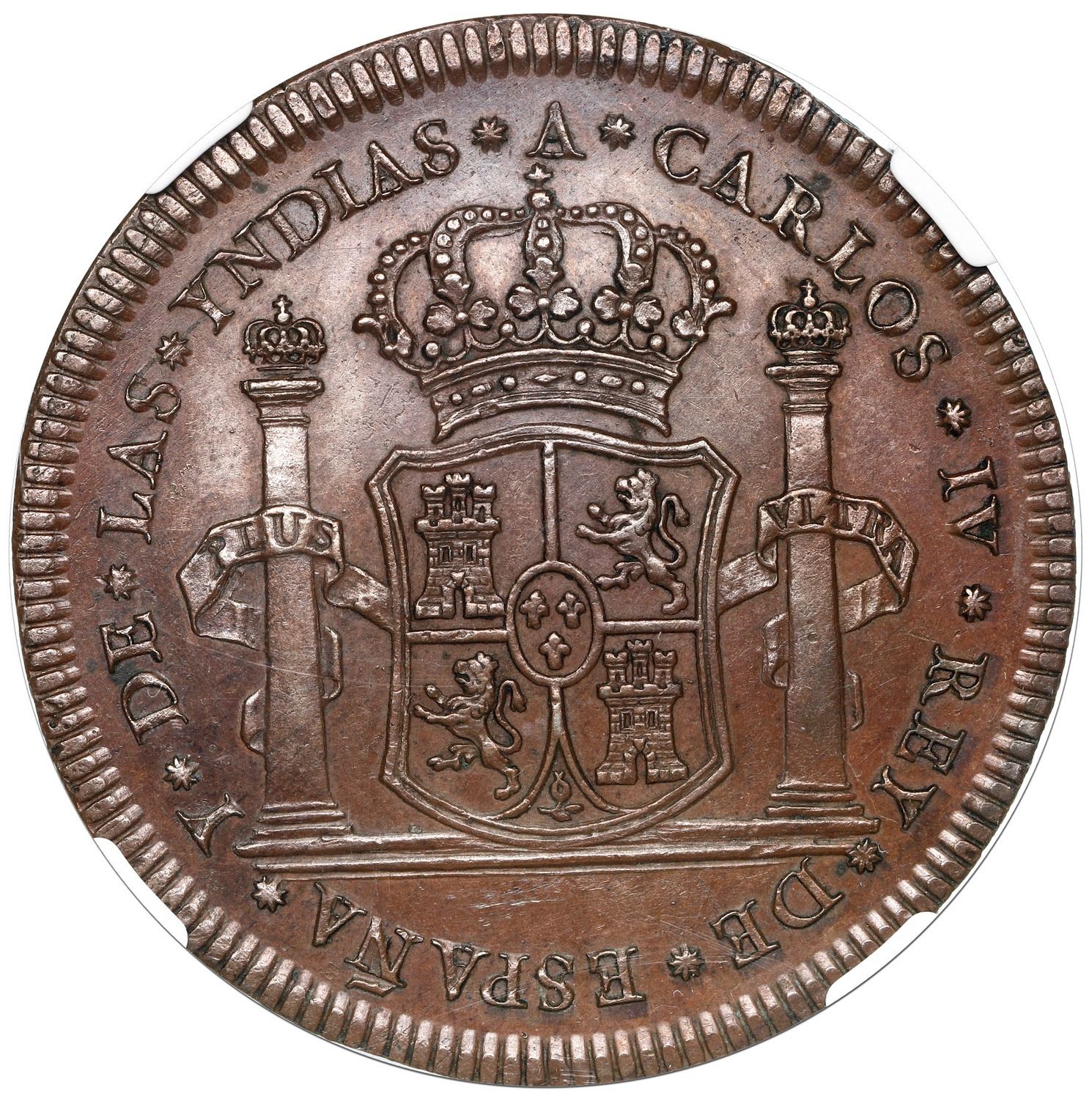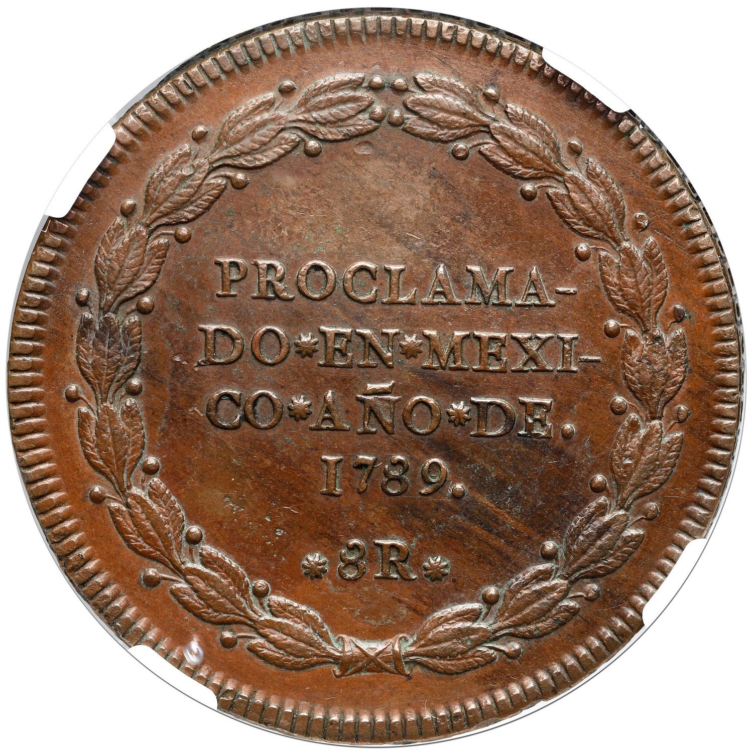 Mexico City, Mexico, bronze 8 reales proclamation medal, Charles IV, 1789, rare, NGC MS 61 Brown. Grove-C9a; Cal-948. Light chocolate brown in color, with smooth fields and lacking any high-point wear, the assigned grade probably due to lack of luster.