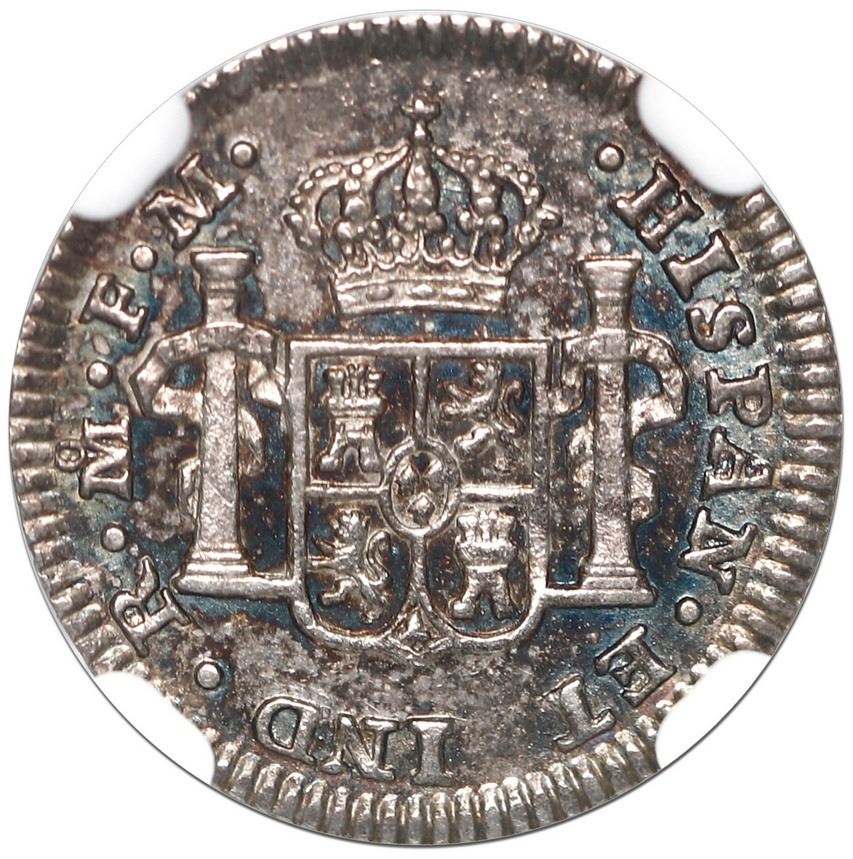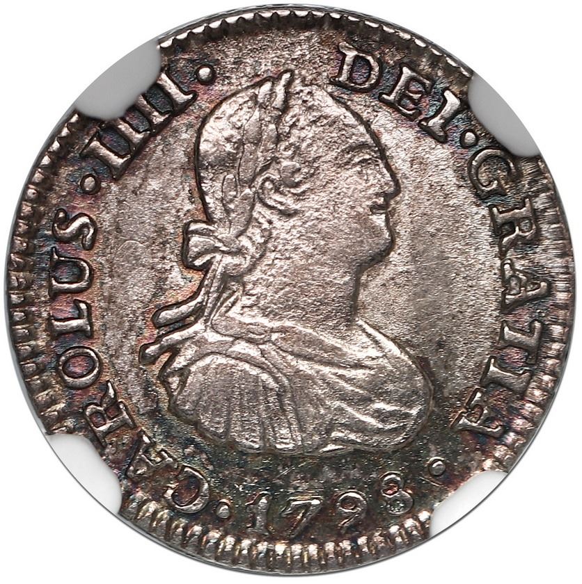 Mexico City, Mexico, bust 1/2 real, Charles IV, 1798 FM, NGC MS 63. Yonaka-M05.98; KM-72; Cal-282. Rainbow toned over muted luster (the reverse splashed with a bright blue), bold rims, the obverse surface slightly grainy (as made).