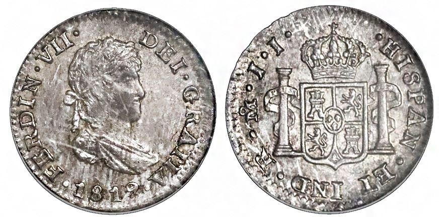 Mexico City, Mexico, bust 1/2 real, Ferdinand VII, 1819/8JJ, rare, NGC MS 63. Yonaka-M05-119a; Cal-409; KM-74. Bold strike, lightly toned over luster, clear overdate, second finest known in NGC census behind a single MS 65. Yonaka rates this overdate as R2. NGC #3014248-033.
